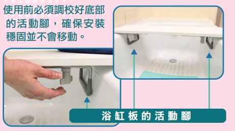 安裝時,將浴缸板橫放於浴缸兩側,調校底部的活動腳,使其緊貼浴缸邊緣,確保不會晃動或滑動。安裝後需按指示定期檢查,防止鬆脫。