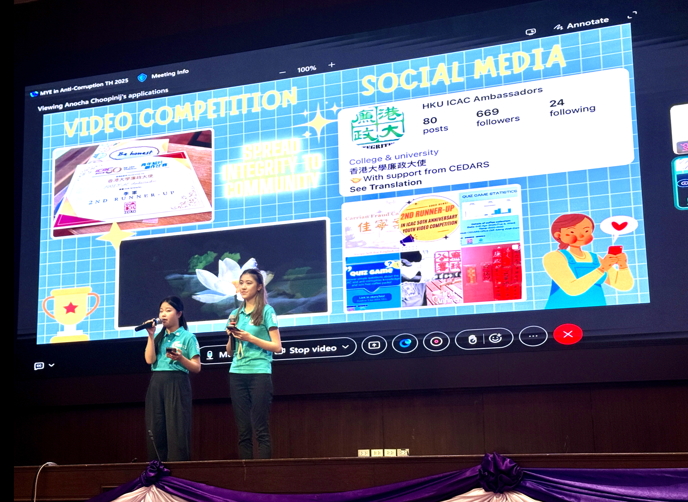 此外,兩位參加廉署菁英誠信領袖計劃的大學生亦獲安排隨團到泰國,親身體驗廉署在國際舞台上分享倡廉經驗,說好香港故事,亦認識國際性反貪議題。二人與參加者交流在反貪工作中青年力量的重要性和影響力,亦透過活動推廣中華文化。