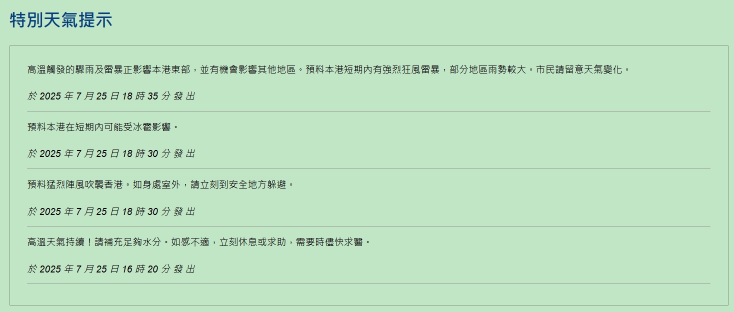 天文台表示,高溫觸發的驟雨及雷暴正影響本港東部,並有機會影響其他地區。預料本港短期內有強烈狂風雷暴,部分地區雨勢較大。市民請留意天氣變化。預料猛烈陣風吹襲香港。如身處室外,請立刻到安全地方躲避。