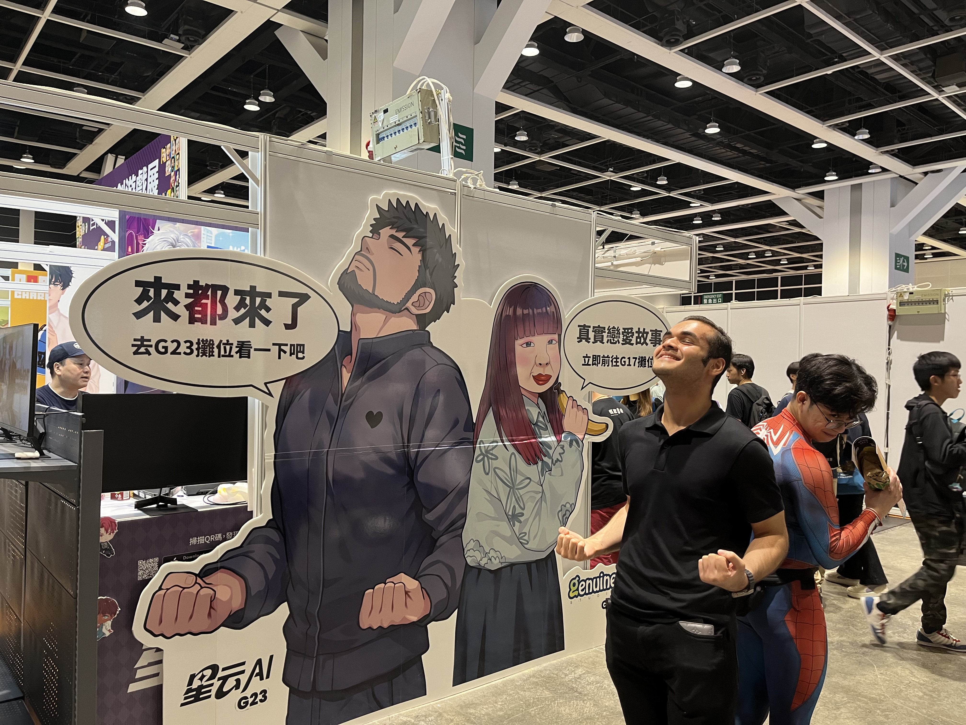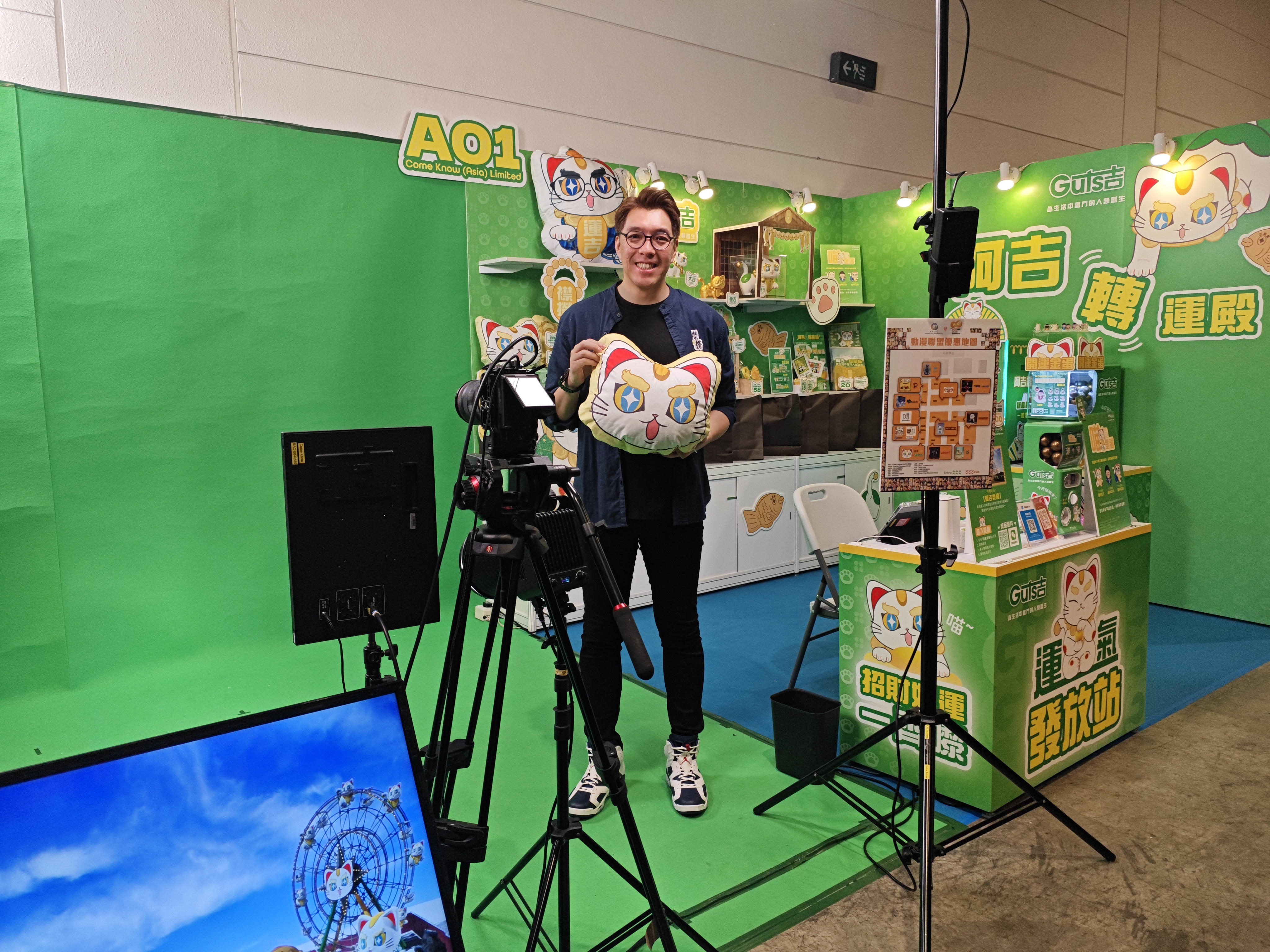 香港原創吉祥物「阿吉」展位負責人蕭先生表示,今年是他第二年參展。展位設計也別出心裁,左側設綠幕,讓參觀者與「阿吉」在虛擬背景下「出片」;右側則售賣主題服飾、茶包、御守等周邊商品,並設「測運機」供投幣遊玩,期望大家「帶幸運回家」。