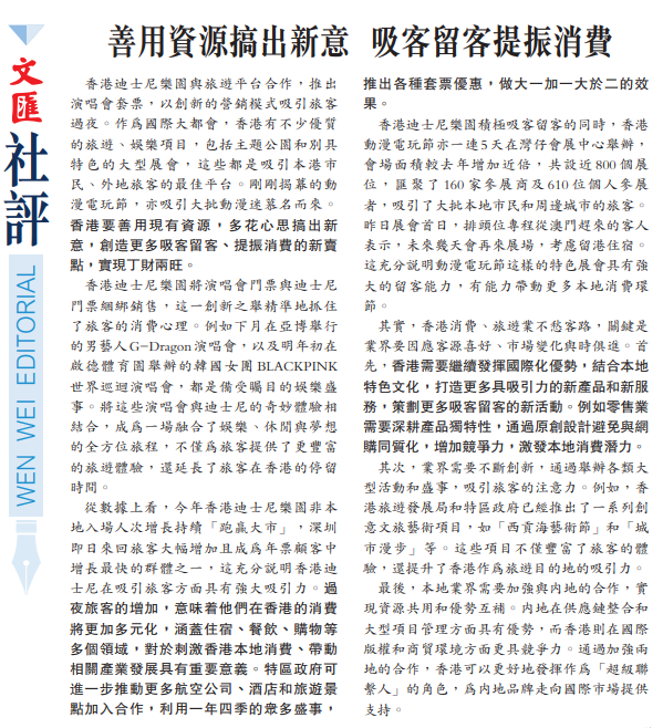 香港迪士尼樂園與旅遊平台合作,推出演唱會套票,以創新的營銷模式吸引旅客過夜。作為國際大都會,香港有不少優質的旅遊、娛樂項目,包括主題公園和別具特色的大型展會,這些都是吸引本港市民、外地旅客的最佳平台。剛剛揭幕的動漫電玩節,亦吸引大批動漫迷慕名而來。香港要善用現有資源,多花心思搞出新意,創造更多吸客留客、提振消費的新賣點,實現丁財兩旺。