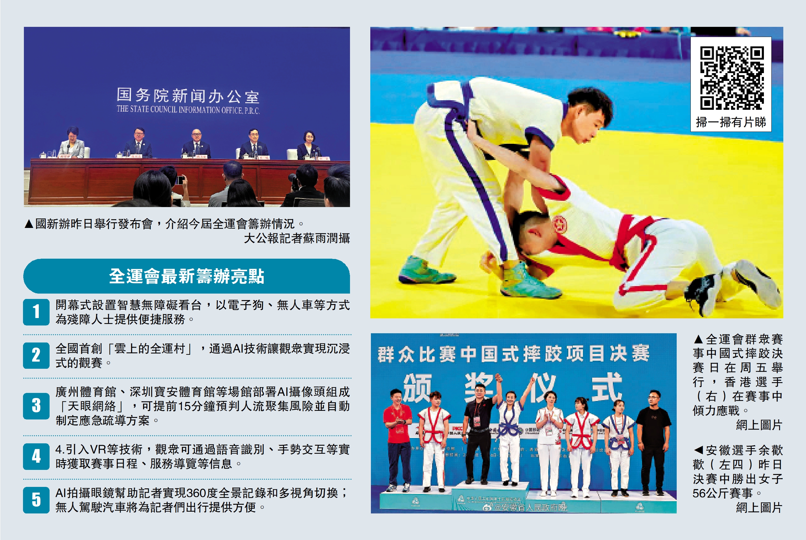 國新辦25日就第15屆全運會籌辦情況舉行新聞發布會,全運會組織委員會副主任、廣東省委常委王曦介紹,今屆賽事在全運歷史上首次實現不新建大型場館,廣東賽區75個比賽場館中超過90%為現有場館升級改造,實現科技賦能。比如作為開幕式場館和田徑賽場的廣東奧體中心,引入智能導航系統,借助AR技術與藍牙定位解決「找座難」痛點,並可通過語音識別、手勢交互等實時獲取賽事信息,感受全新觀賽體驗。