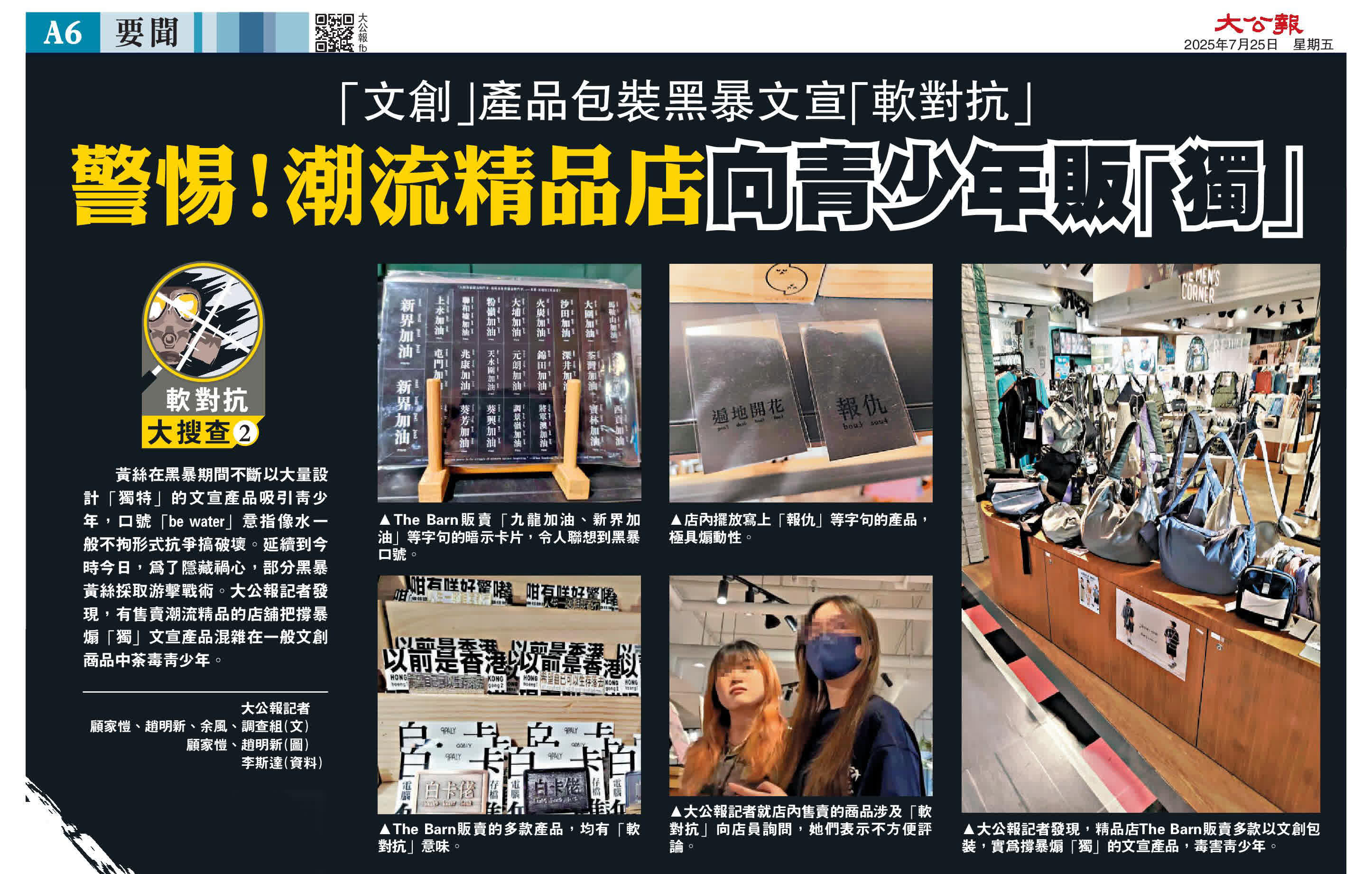 大公報25日報道,精品店The Barn把撐暴煽「獨」文宣產品混雜在一般文創商品中荼毒青少年,落「獨」於無形。