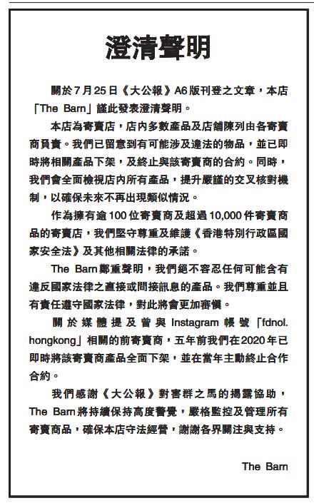 The Barn今日(26日)於《大公報》就事件發表澄清聲明,指該店為寄賣店,店內多數產品及店舖陳列由各寄賣商負責。店方已留意到有可能涉及違法的物品,並已即時將相關產品下架,及終止與該寄賣商的合約。同時,店方會全面檢視店內所有產品,提升嚴謹的交叉核對機制,以確保未來不再出現類似情況。