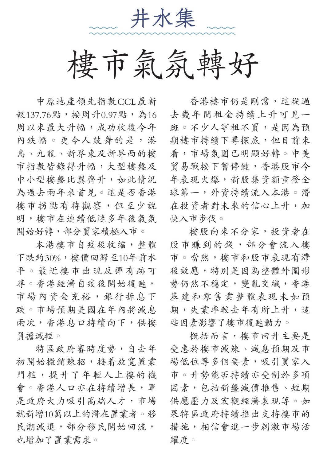 中原地產領先指數CCL最新報137.76點,按周升0.97點,為16周以來最大升幅,成功收復今年內跌幅。更令人鼓舞的是,港島、九龍、新界東及新界西的樓市指數皆錄得升幅,大型樓盤及中小型樓盤比翼齊升,如此情況為過去兩年來首見。這是否香港樓市拐點有待觀察,但至少說明,樓市在連續低迷多年後氣氛開始好轉,部分買家積極入市。