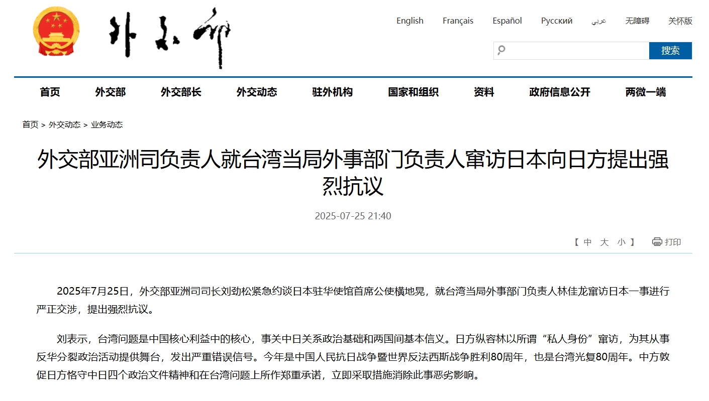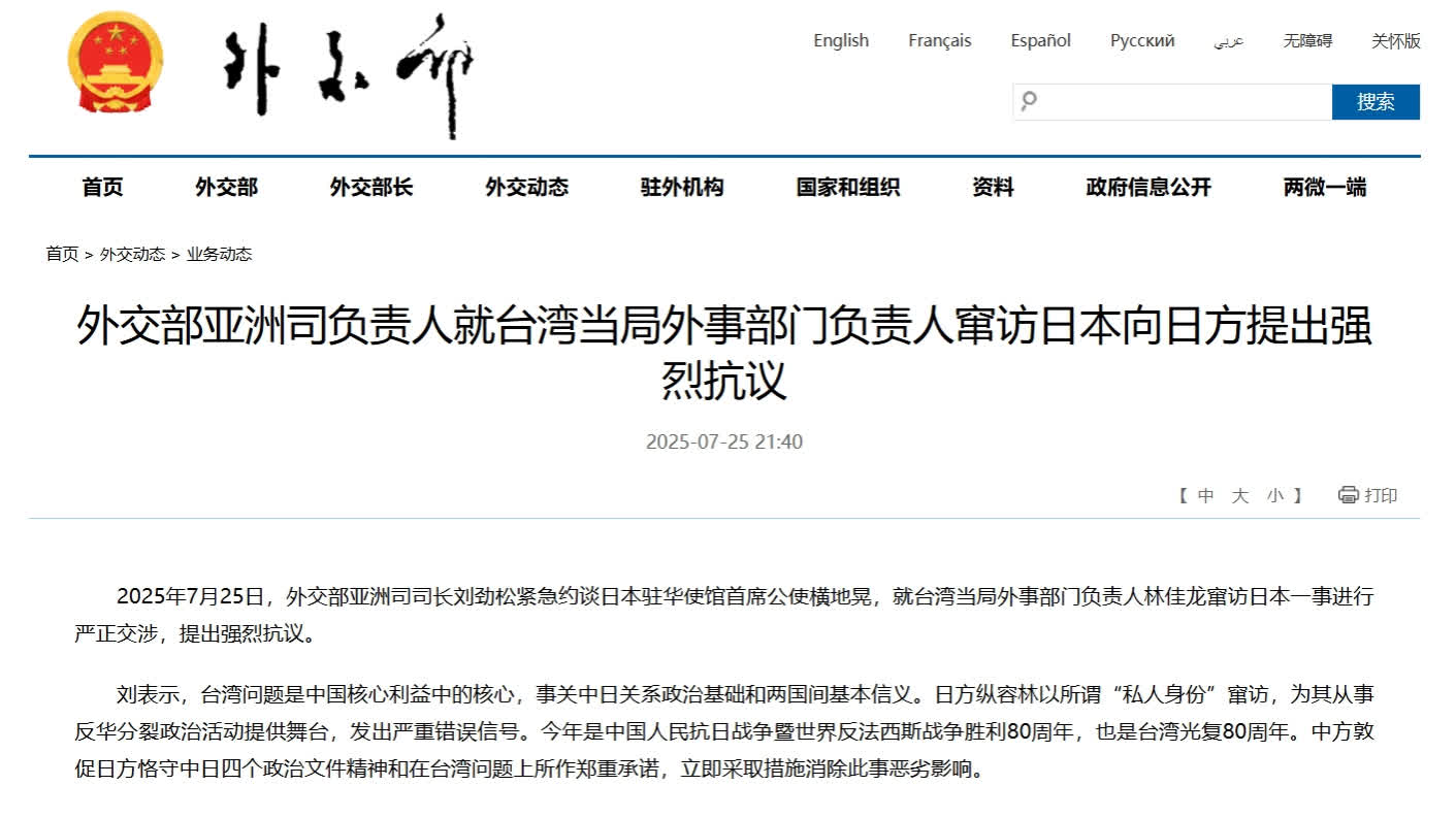 據外交部網站消息,7月25日,外交部亞洲司司長劉勁松緊急約談日本駐華使館首席公使橫地晃,就台灣當局外事部門負責人林佳龍竄訪日本一事進行嚴正交涉,提出強烈抗議。