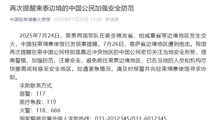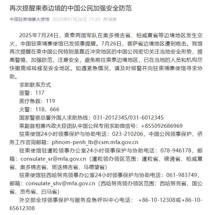 大公文匯網報道,7月26日,中國駐柬埔寨大使館發文,再次提醒在柬中國公民特別是靠近衝突地區的中國公民密切關注當地安全形勢,提高警惕,加強防範,注意安全,避免前往柬泰邊境地區,已在當地的人員和機構盡快撤離或轉移至安全地區。