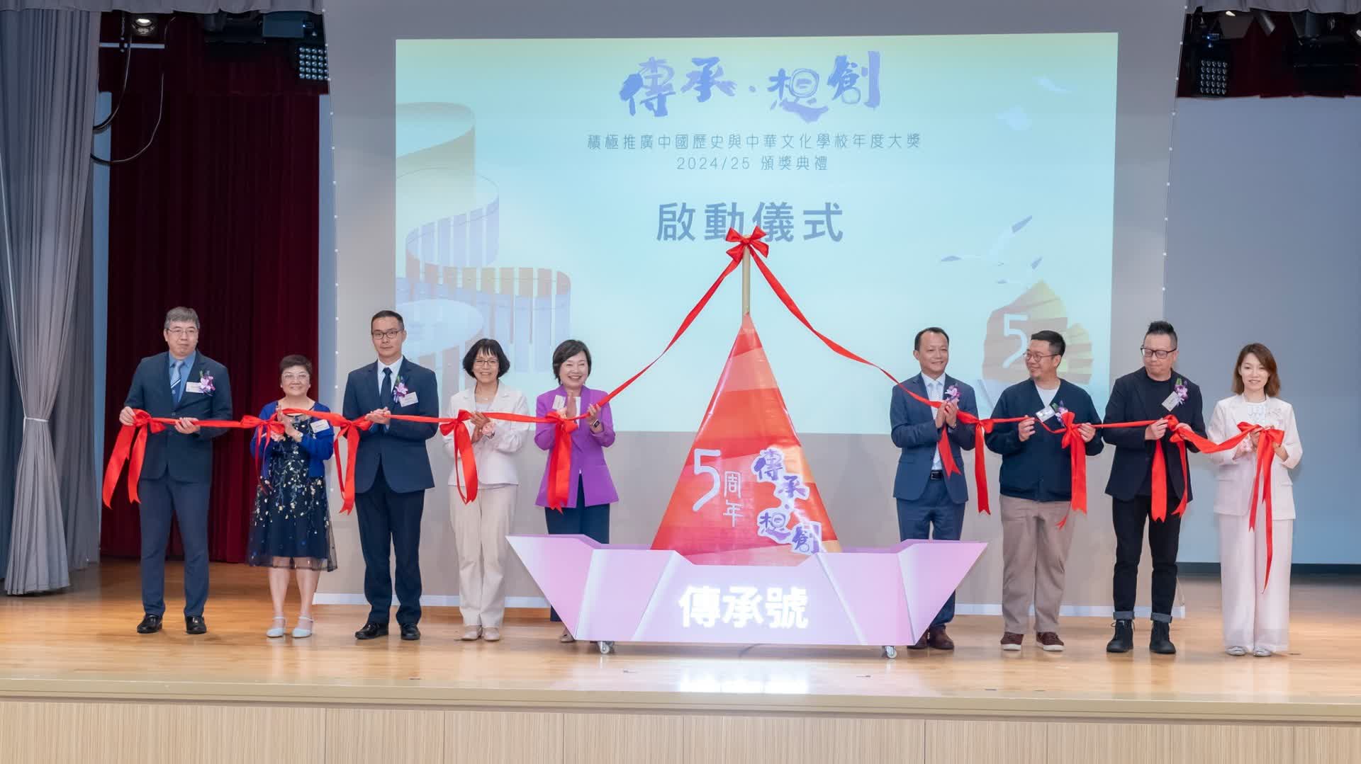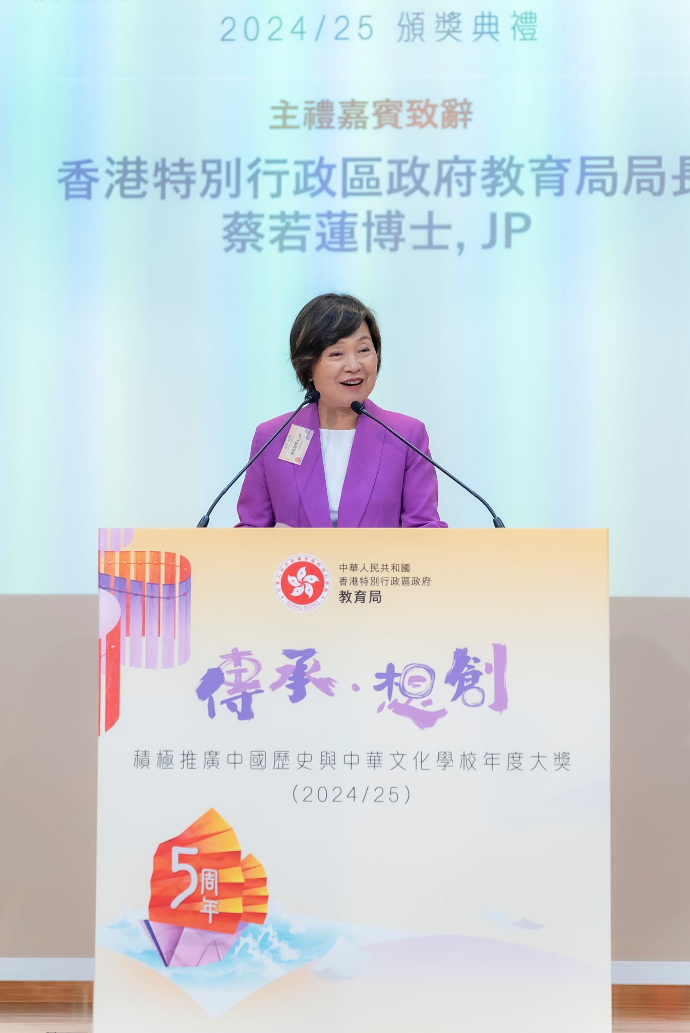 蔡若蓮表示,今年的4項活動分別為:「想·創·中國歷史——學生自學平台」線上學習活動;第九屆全港學界「中史解碼」——電子賀卡設計比賽;「歷史四維遊」全港中學生活動;全港初中中國歷史文化問答比賽。最後,有39間中學獲頒年度大獎和嘉許獎。頒獎典禮以揚帆啟航為主題,寄寓學生繼往開來的使命。大會亦設計了融合中國歷史元素、香港小巴牌和路牌特色的道具,盡顯開拓創新精神。