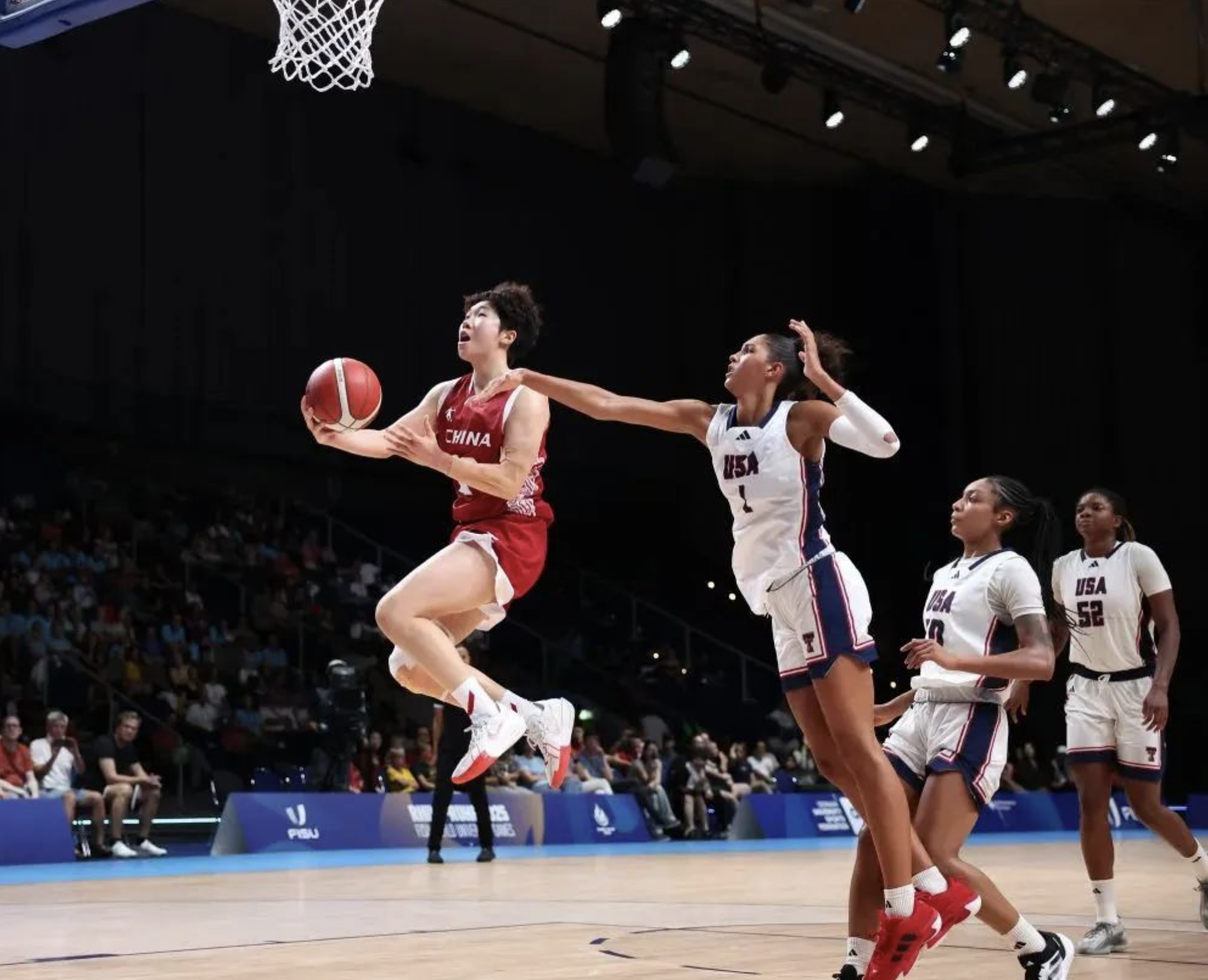 第一節,美國隊率先發力,一度取得7分的領先。陳玉婕在節末命中壓哨三分,幫助中國隊以21:24緊咬比分結束首節。第二節,劉禹彤出現犯規,美國隊後衛德納·弗里茨兩罰全中,將比分擴大至35:28,隨後中國隊打出一波7:0的反擊高潮,將比分追成35平。隨着後衛曹博怡兩罰全中,雙方以42:42戰平進入下半場。