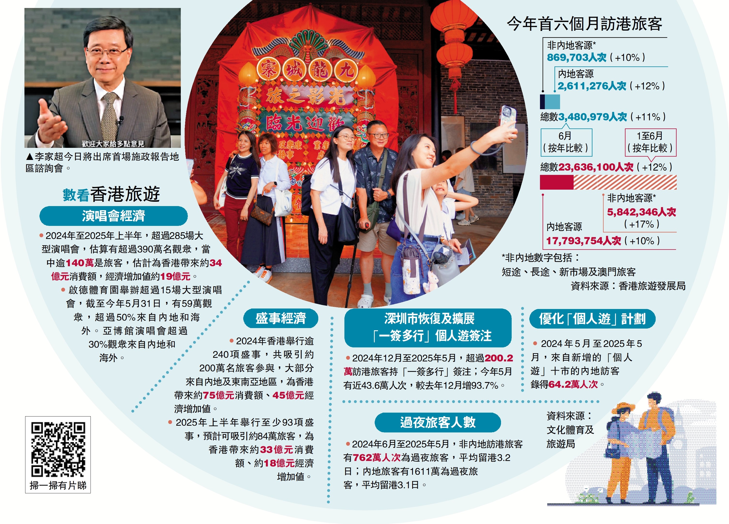 李家超昨日在社交平台,發布《施政·再報告》第二集短片,公布今年上半年訪港旅客數字,整體有約2400萬旅客人次,按年增加12%,其中內地旅客佔74%,有約1780萬人次,按年增加10%,非內地旅客更較去年同期顯著增加17%,錄得584萬人次。