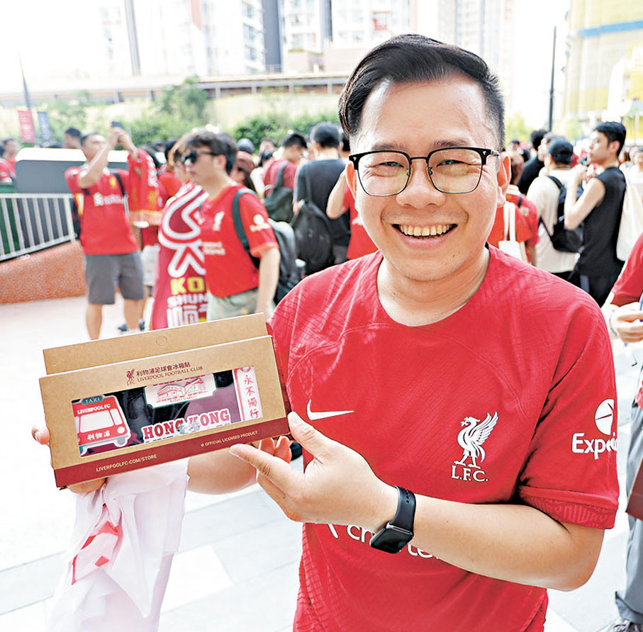 來自湖南的朱先生與女兒同行訪港。「我是來看球賽,順便旅遊;我女兒是陪我來香港,順便看演唱會。」朱先生笑說,他此行為支持利物浦而來,上周四(24日)下午已在啟德體育園觀看球隊公開訓練環節,並參加了湖南利物浦球迷會舉辦的活動,預計將花費約2,000元購買球隊周邊商品,並會選購化妝品作為家人的手信。