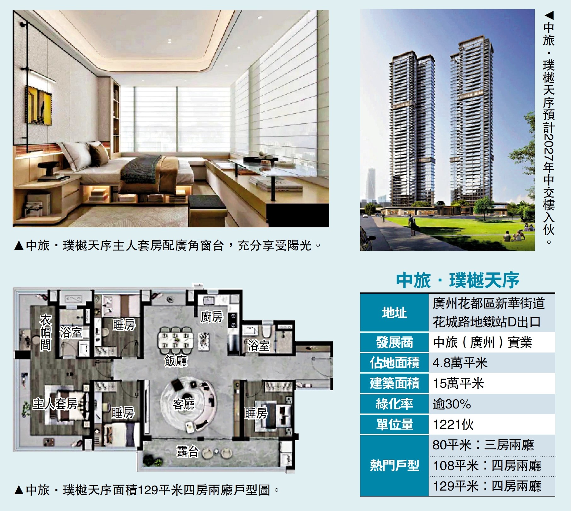 位於廣州北站西廣場旁的中旅·璞樾天序,規劃興建1221伙,單位面積涵蓋80至129平米,間隔由三房至四房,主打剛需及改善型市場。項目銷售負責人李先生表示,該盤是目前花都區內唯一真正意義上位於高鐵、地鐵、商業三軸核心的複合型社區,未來將打造為集居住、商辦、旅遊於一體的生活中心,發展路徑可類比香港西九龍站上蓋項目。