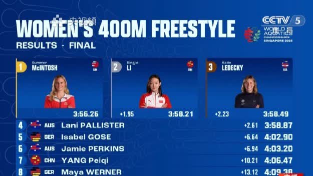 大公文匯網報道,7月27日,2025世界泳聯世錦賽女子400米自由泳決賽,李冰潔獲得銀牌,另一位中國選手楊佩琪收穫第七。