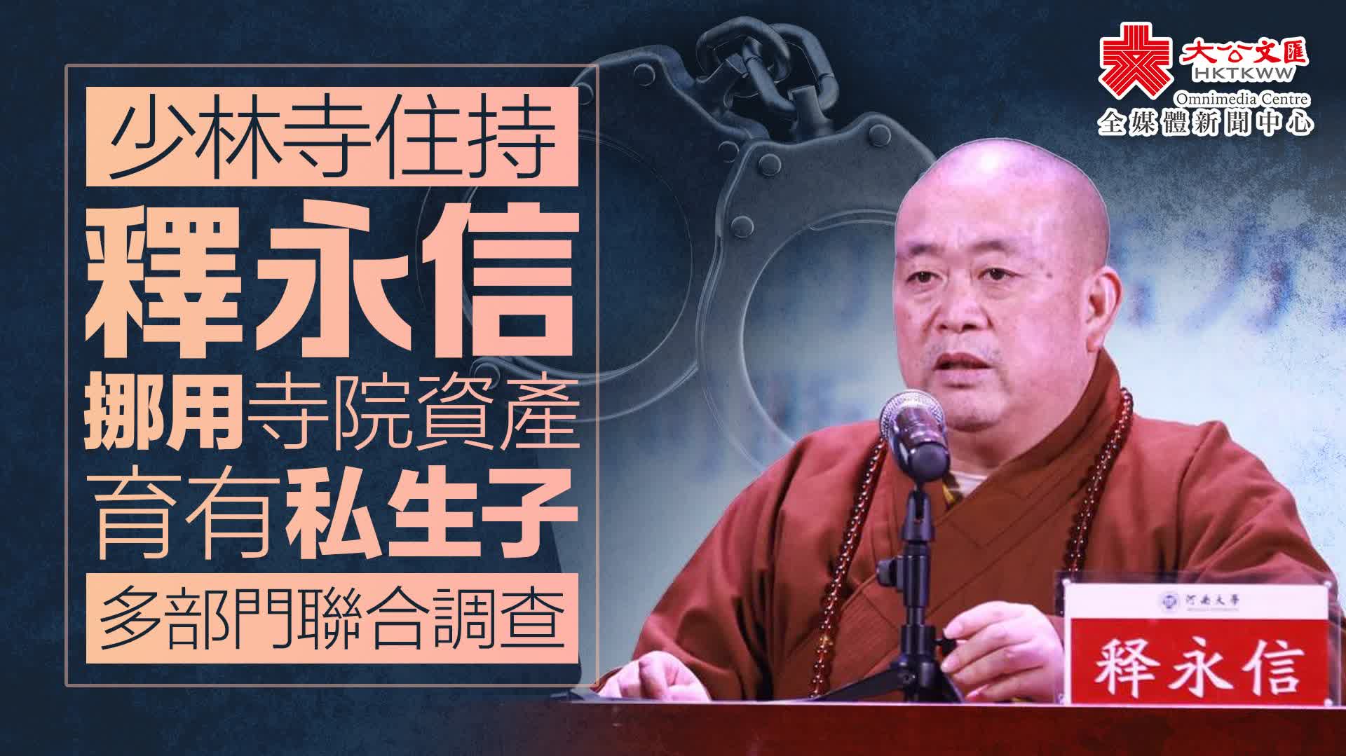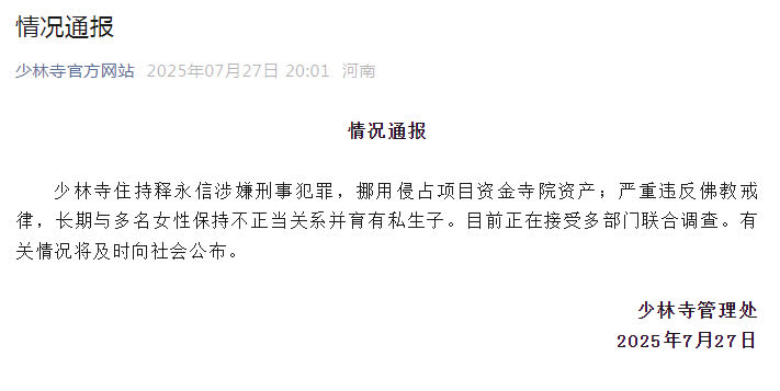 少林寺住持釋永信涉嫌刑事犯罪,挪用侵佔項目資金寺院資產;嚴重違反佛教戒律,長期與多名女性保持不正當關係並育有私生子,目前正在接受多部門聯合調查。有關情況將及時向社會公布。