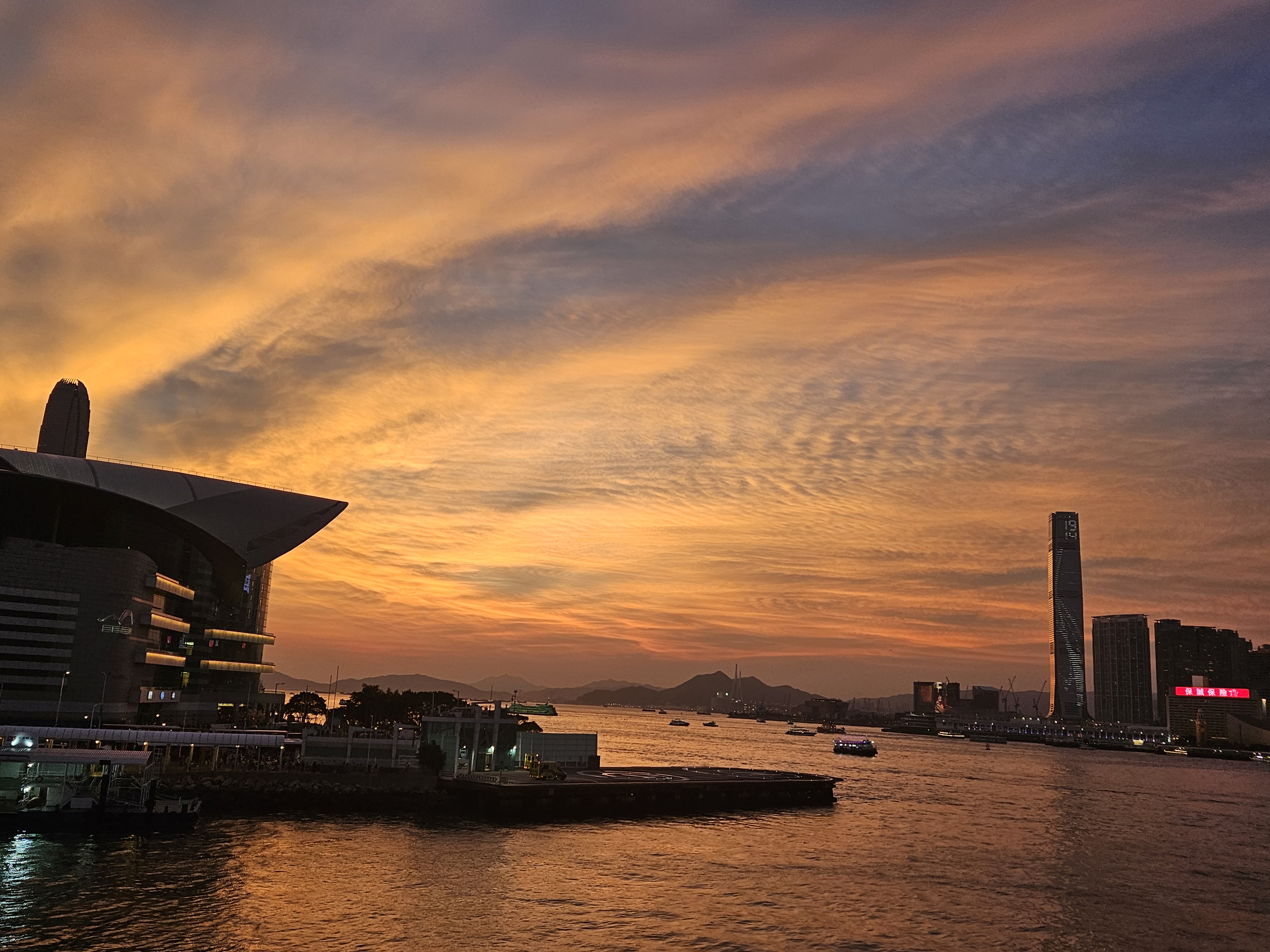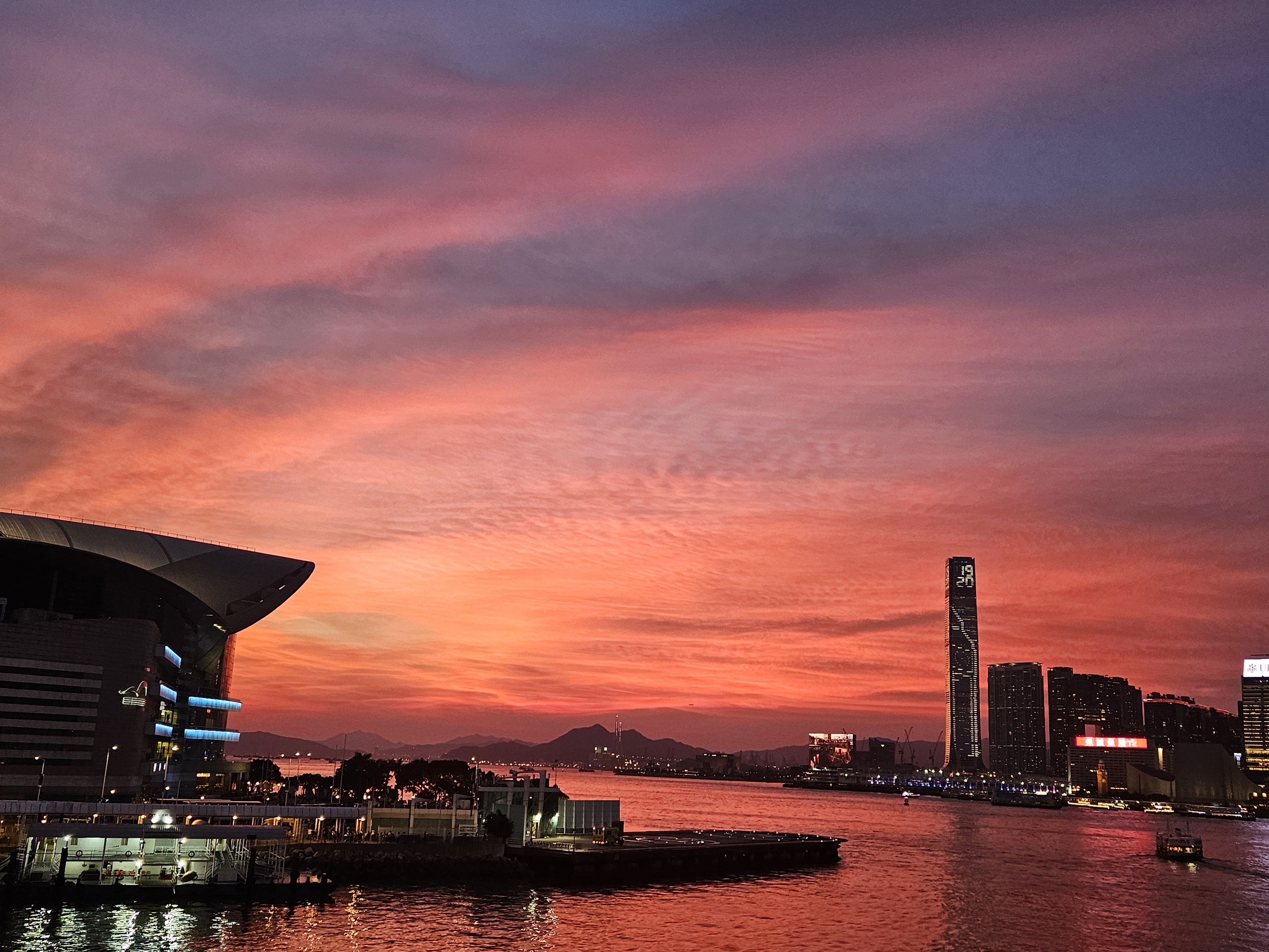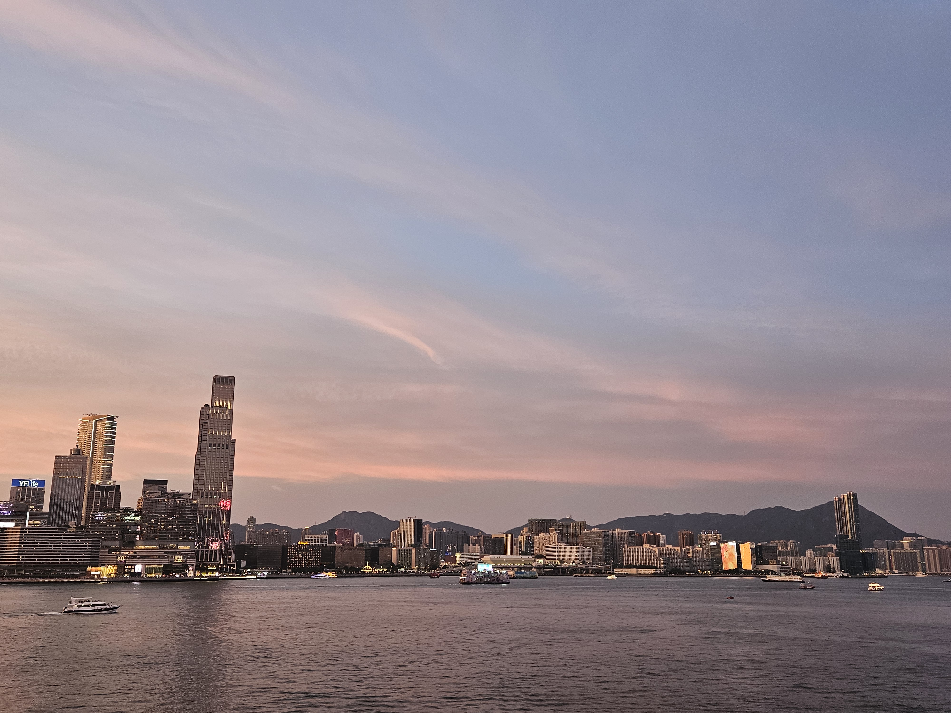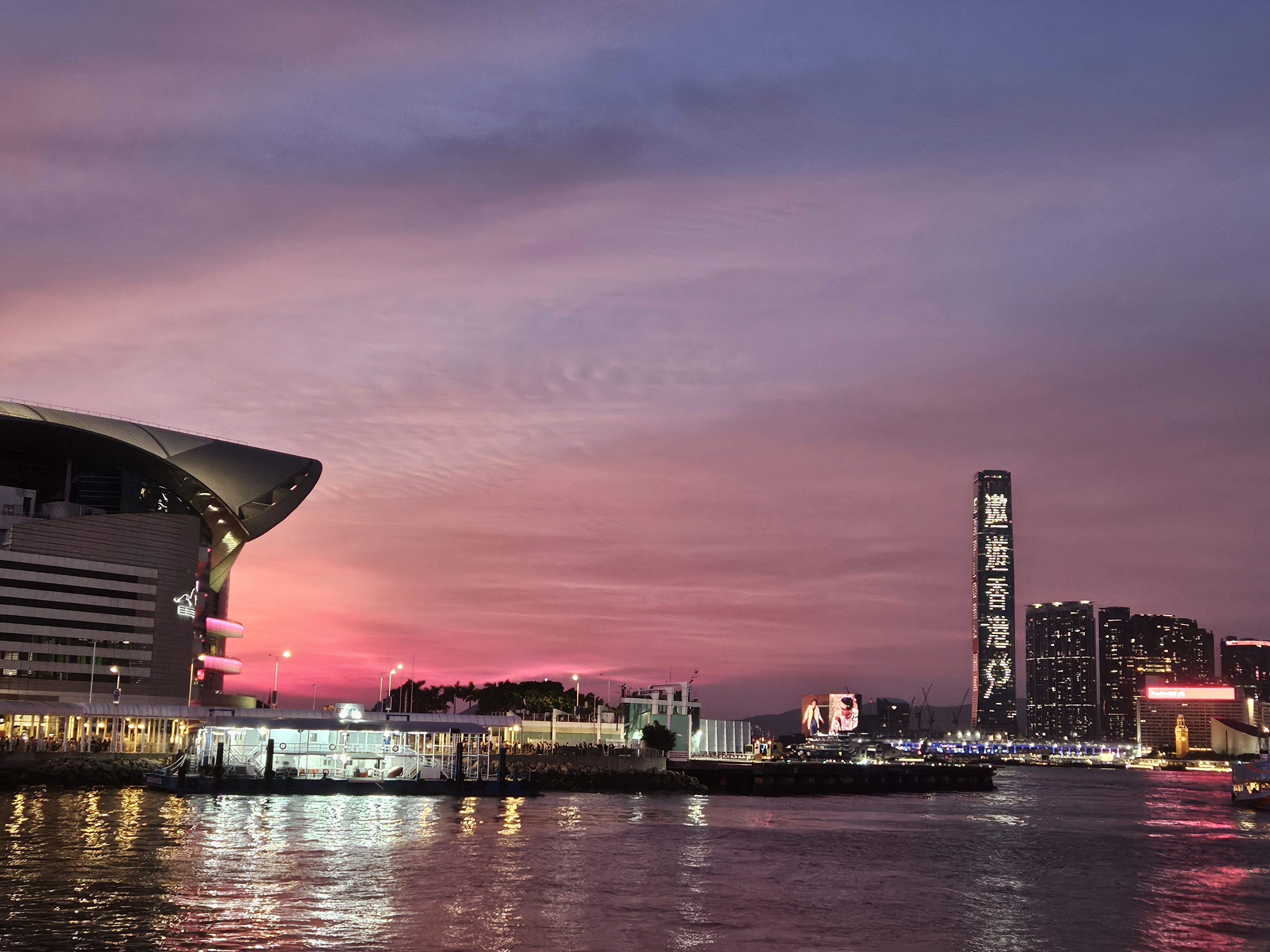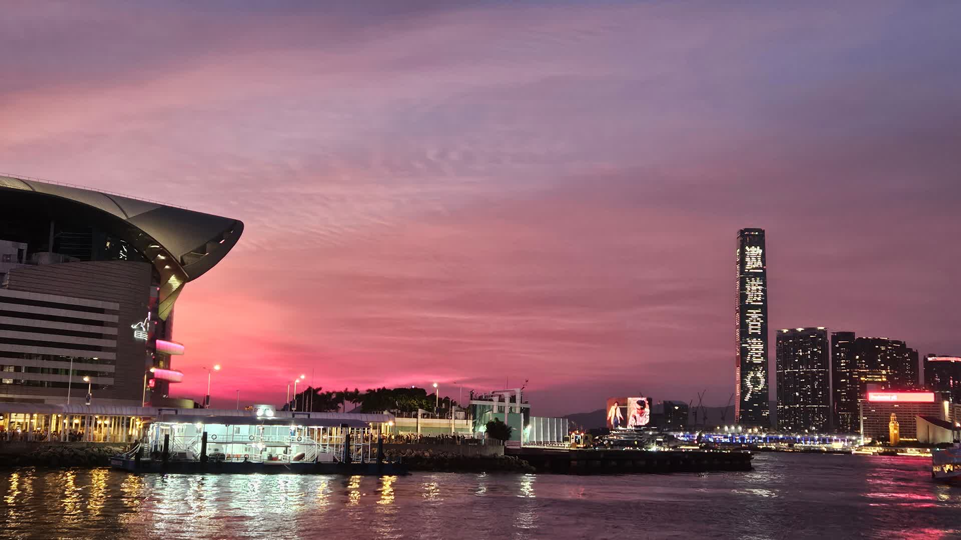 傍晚6時半後,太陽開始西沉,天際泛起柔和的淡金色,雲層被勾勒出亮邊。隨時間推移,維港上空由金黃漸變為橙紅,雲層折射出粉紫交錯的色調,維港兩岸的燈火亮起,宣告晝夜交替完成。