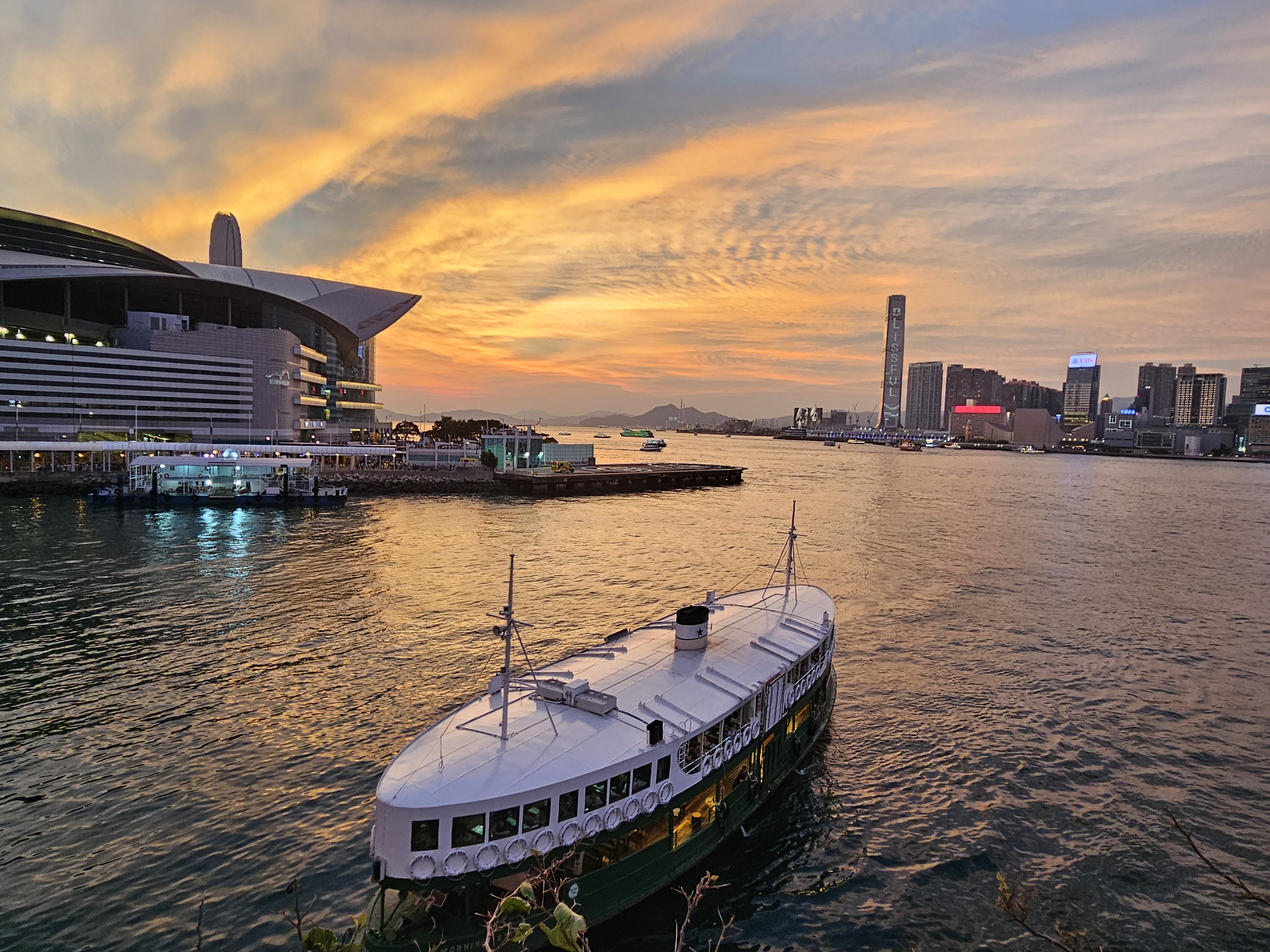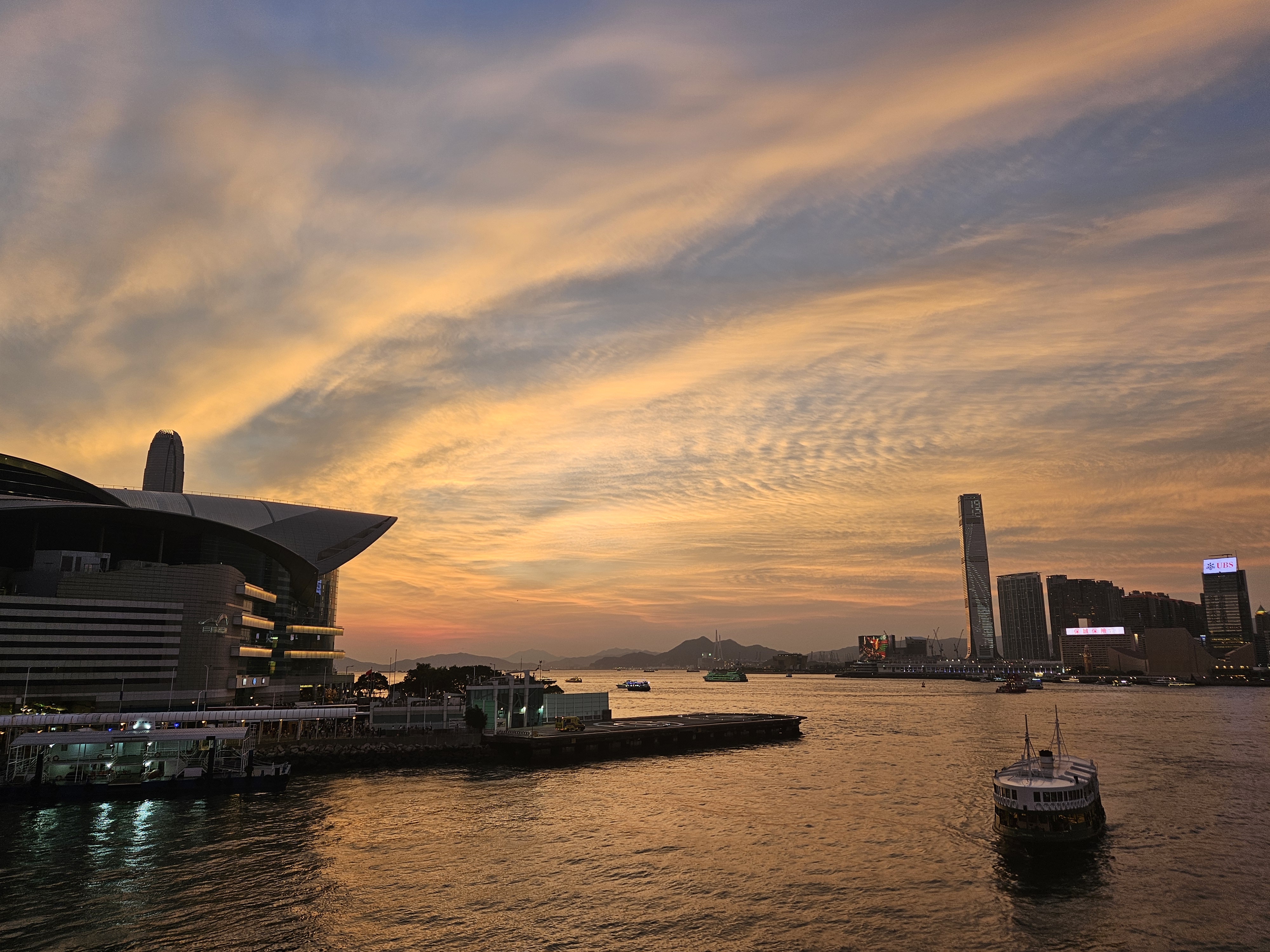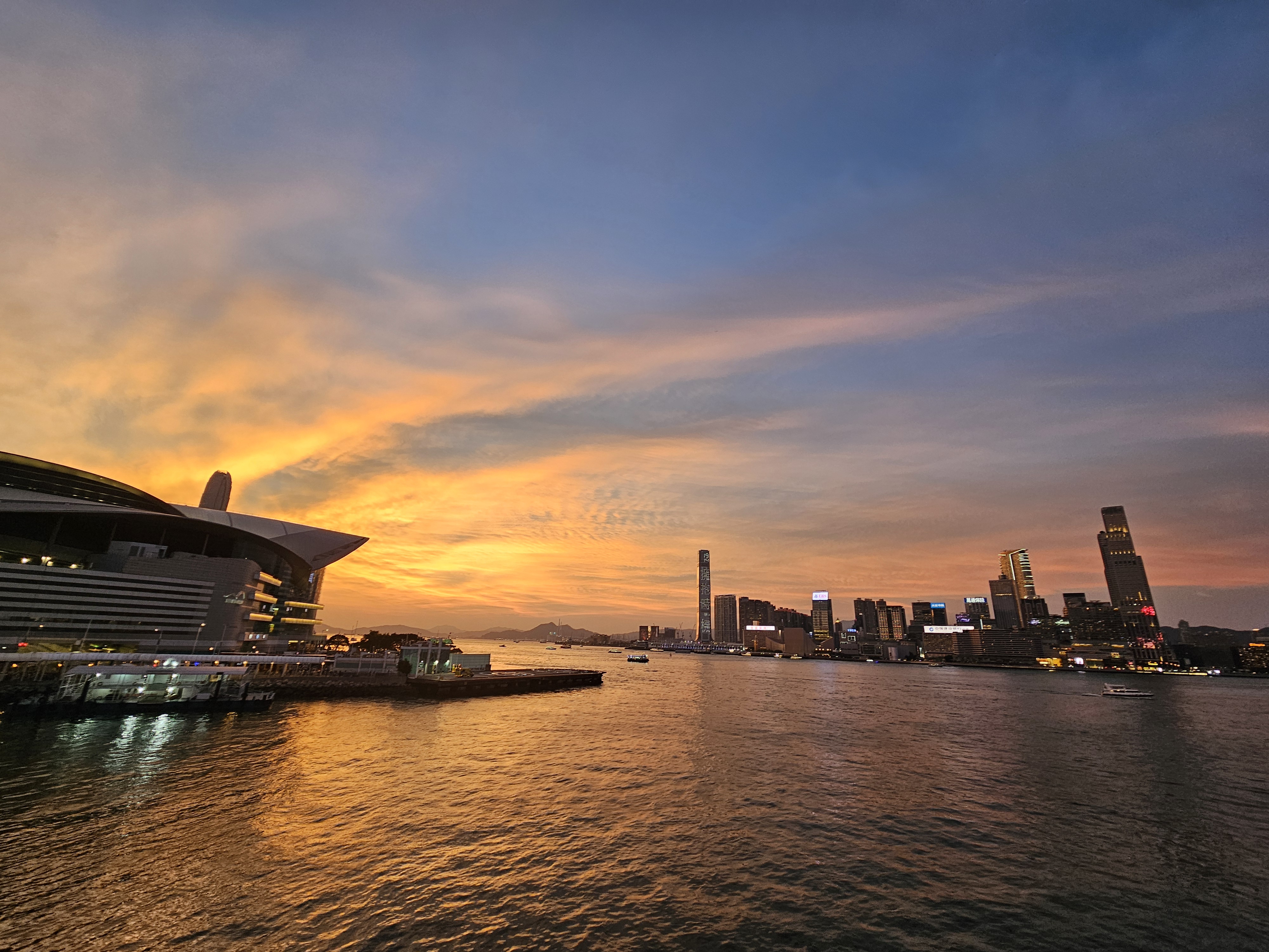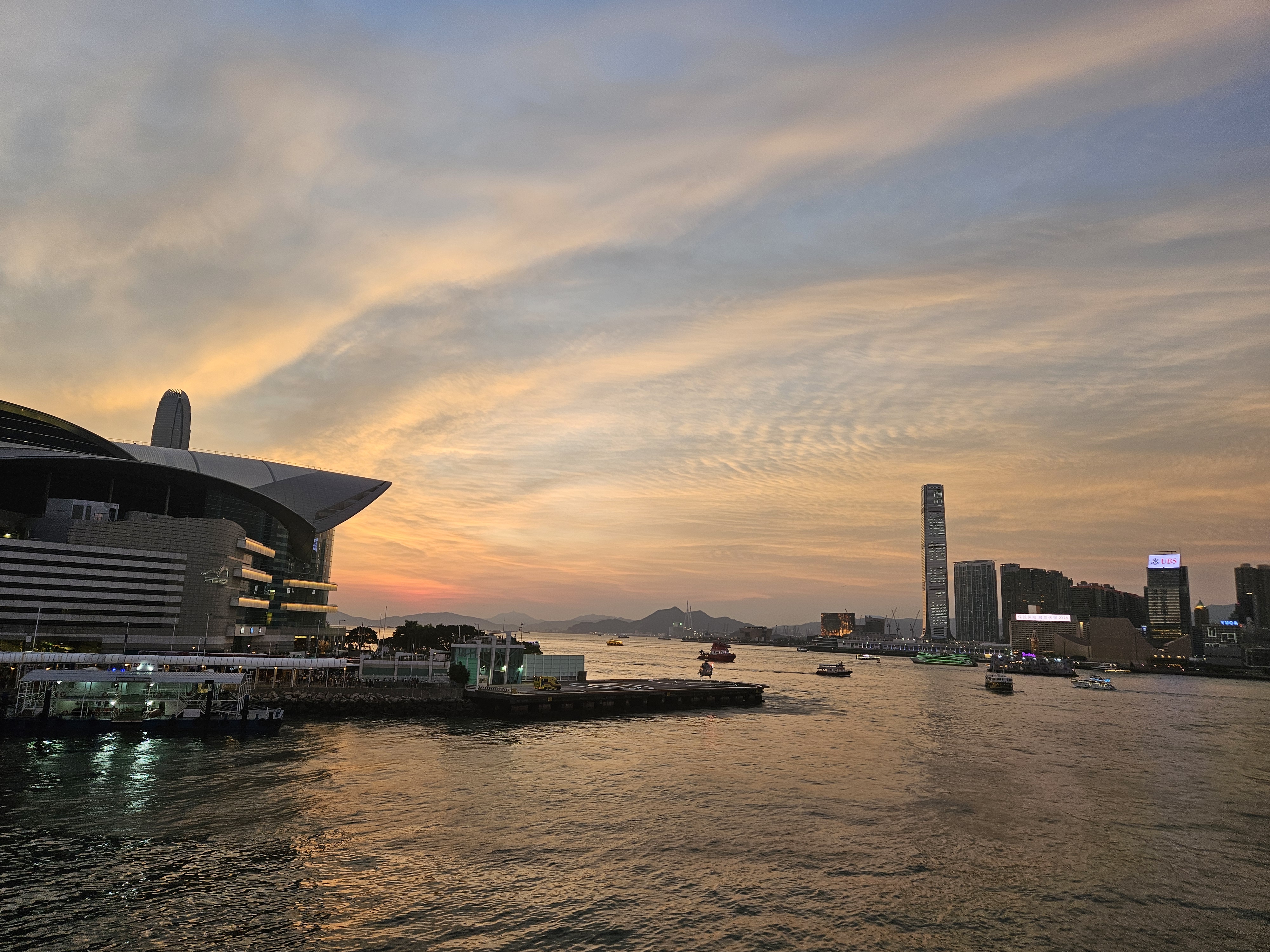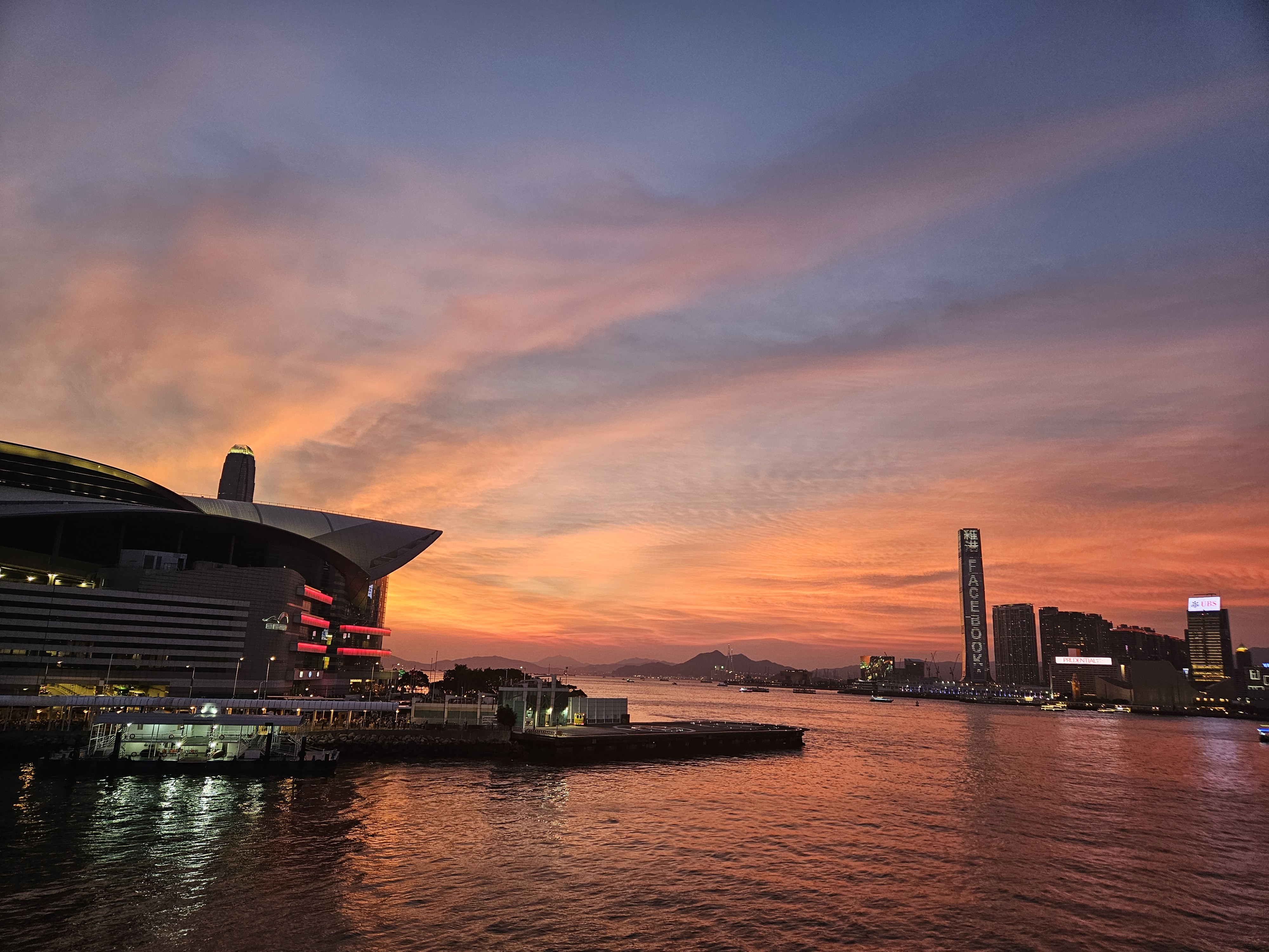 傍晚6時半後,太陽開始西沉,天際泛起柔和的淡金色,雲層被勾勒出亮邊。隨時間推移,維港上空由金黃漸變為橙紅,雲層折射出粉紫交錯的色調,維港兩岸的燈火亮起,宣告晝夜交替完成。