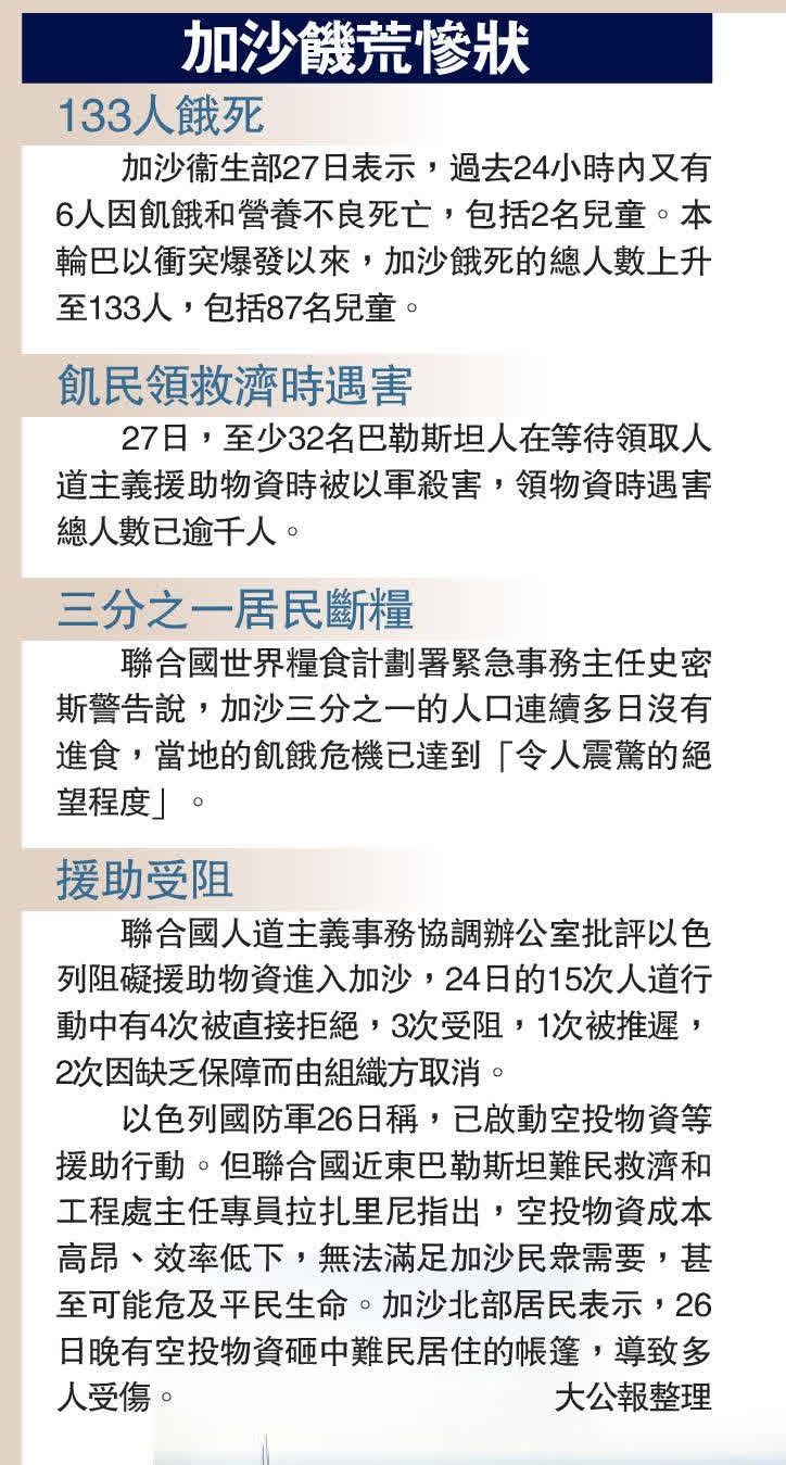 聯合國世界糧食計劃署緊急事務主任史密斯警告說,加沙三分之一的人口連續多日沒有進食。加沙衞生部27日表示,過去24小時內又有6人因飢餓和營養不良死亡,包括2名兒童。本輪巴以衝突爆發以來,加沙餓死的總人數上升至133人,包括87名兒童。
