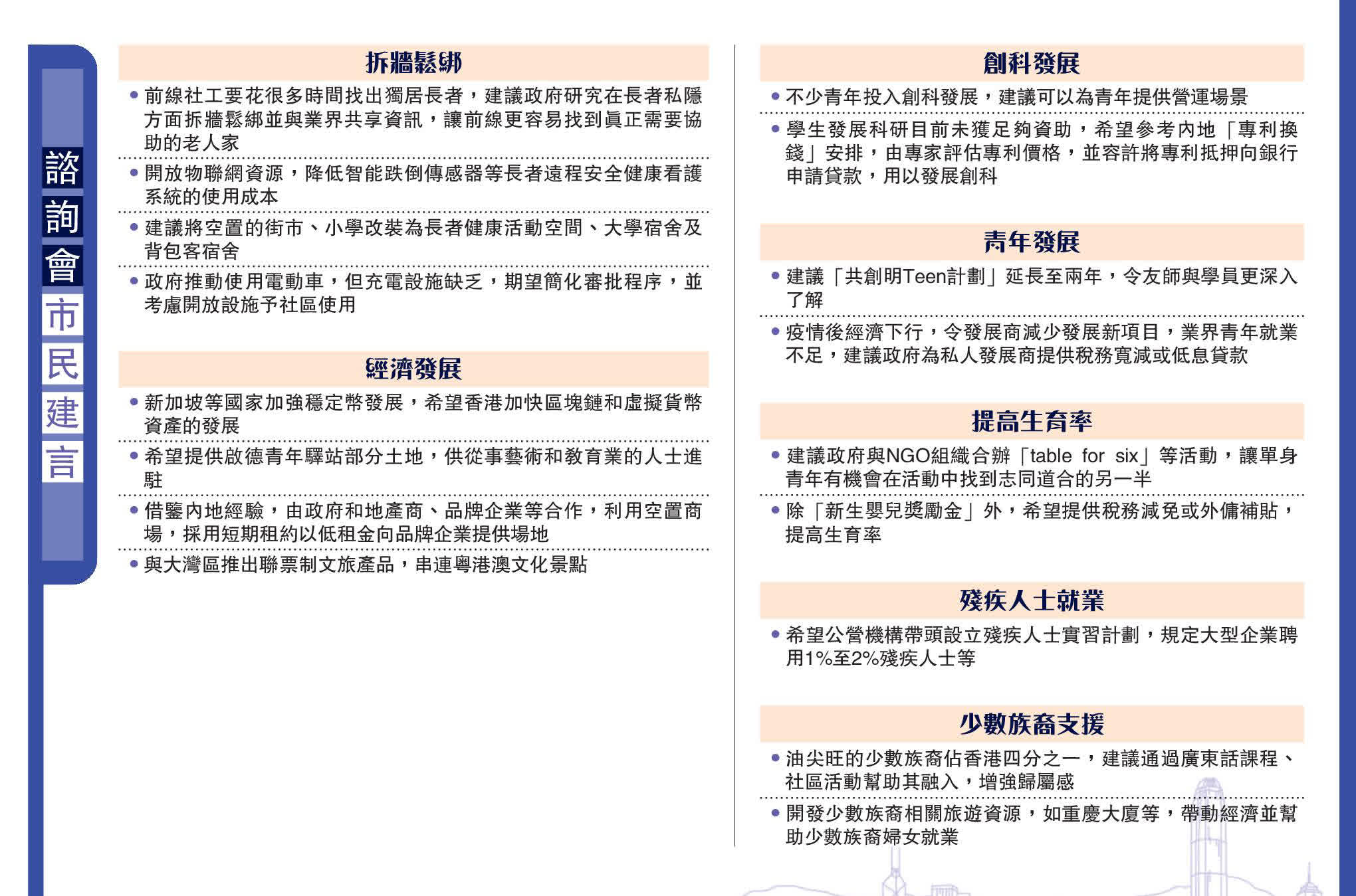 不少市民認為,特區政府的多項政策有拆牆鬆綁的空間,呼籲政府簡化流程,提升效率。建造業從業員呂先生認為,業界長期以低於成本投標,導致拖欠工資、爛尾等情況,建議政府為私人發展商提供稅務寬減或低息貸款等,並設立基金用於社區建設,從而強化建設過程中的審批流程,提升效率。