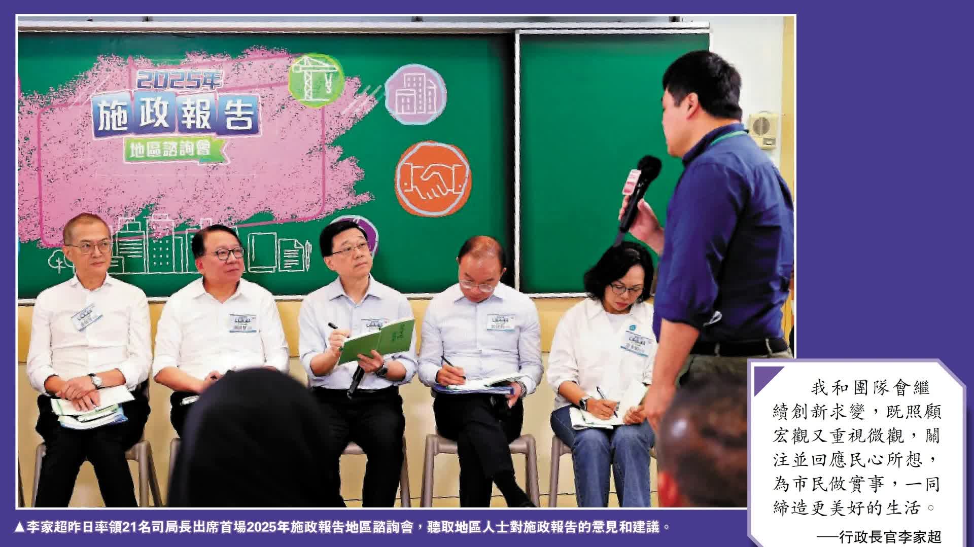 (大公報 記者 義昊)行政長官李家超將於9月發表任內第四份施政報告,他昨日率領21名司局長出席施政報告的首場地區諮詢會,聽取地區人士的意見。市民積極建言獻策,內容涉及創新科技、青年發展、社會福利等多個議題。