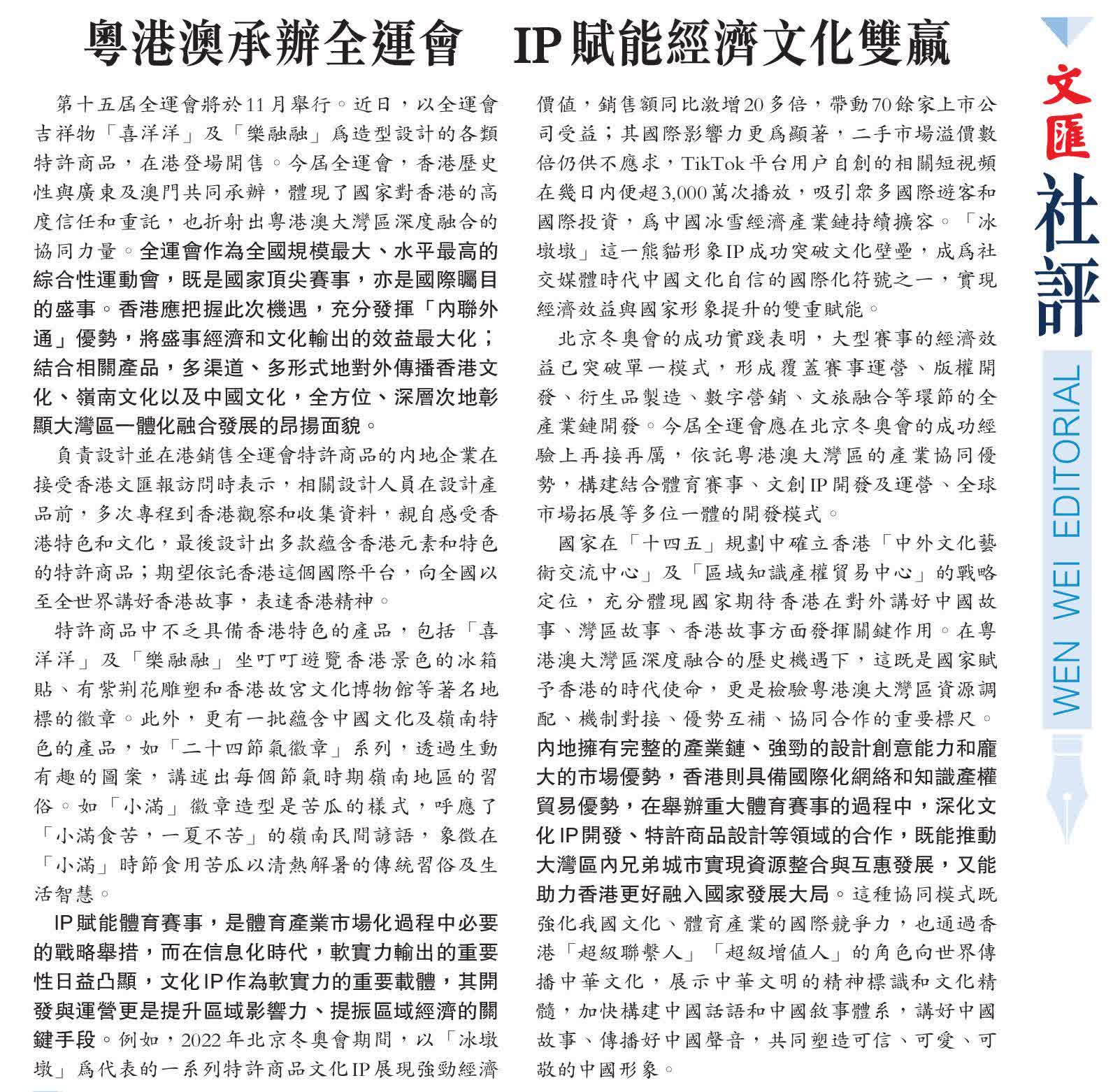 第十五屆全運會將於11月舉行。近日,以全運會吉祥物「喜洋洋」及「樂融融」為造型設計的各類特許商品,在港登場開售。今屆全運會,香港歷史性與廣東及澳門共同承辦,體現了國家對香港的高度信任和重託,也折射出粵港澳大灣區深度融合的協同力量。全運會作為全國規模最大、水平最高的綜合性運動會,既是國家頂尖賽事,亦是國際矚目的盛事。香港應把握此次機遇,充分發揮「內聯外通」優勢,將盛事經濟和文化輸出的效益最大化;結合相關產品,多渠道、多形式地對外傳播香港文化、嶺南文化以及中國文化,全方位、深層次地彰顯大灣區一體化融合發展的昂揚面貌。