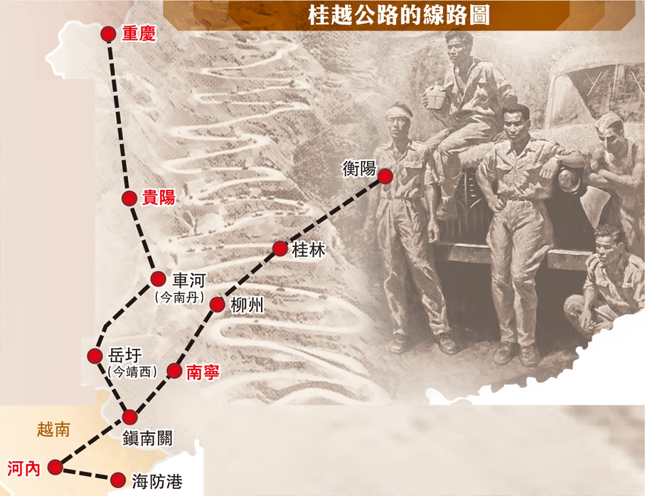 (香港文匯報 新聞調查部)日本發動侵華戰爭後,中國沿海港口先後淪陷,國際物資無法運抵中國戰場。1937年至1945年,中國與國際社會合力開闢新運輸線,新疆—蘇聯運輸線、滇緬公路、桂越公路、滇越鐵路、駝峰航線、史迪威公路接連投入使用,源源不斷的援華物資抵港待轉運。1939年僑領陳嘉庚發起招募,3,900(國新辦2015發布會數據)多名南洋華僑青年毅然告別優渥的生活,分15批穿越烽火,其中9批經越南海防、河內,從鎮南關(今友誼關)踏入國門,奔赴滇緬公路與桂越公路的生死運輸線,以血肉之軀將75萬噸(含滇緬公路45萬噸)作戰物資運送到前線。