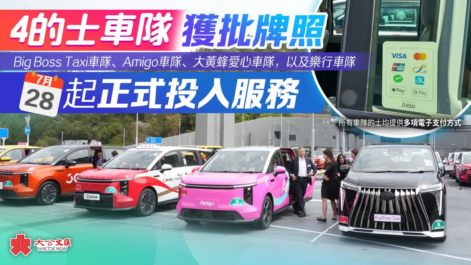 大公文匯全媒體報道,運輸署今日(28日)宣布,4支的士車隊獲發正式的士車隊牌照,為期5年,包括Big Boss Taxi車隊、Amigo車隊、大黃蜂愛心車隊,以及樂行車隊。4支車隊由今日起正式投入服務。