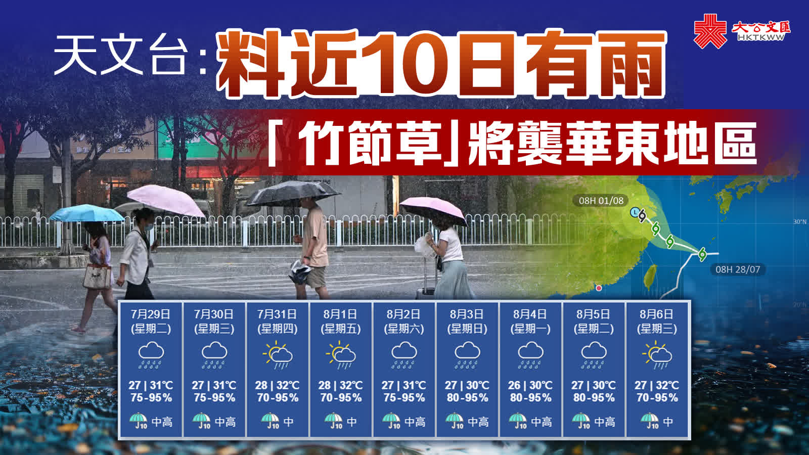 大公文匯全媒體報道,天文台表示,本周至下周初天氣不穩,預測今日(28日)至8月6日10日間大部分時間有驟雨,周六(8月2日)間中有驟雨及幾陣雷暴,下周日至周二(8月3日至5日)有驟雨及幾陣狂風雷暴。此外,「竹節草」會在未來一兩日橫過東海,靠近華東沿岸。