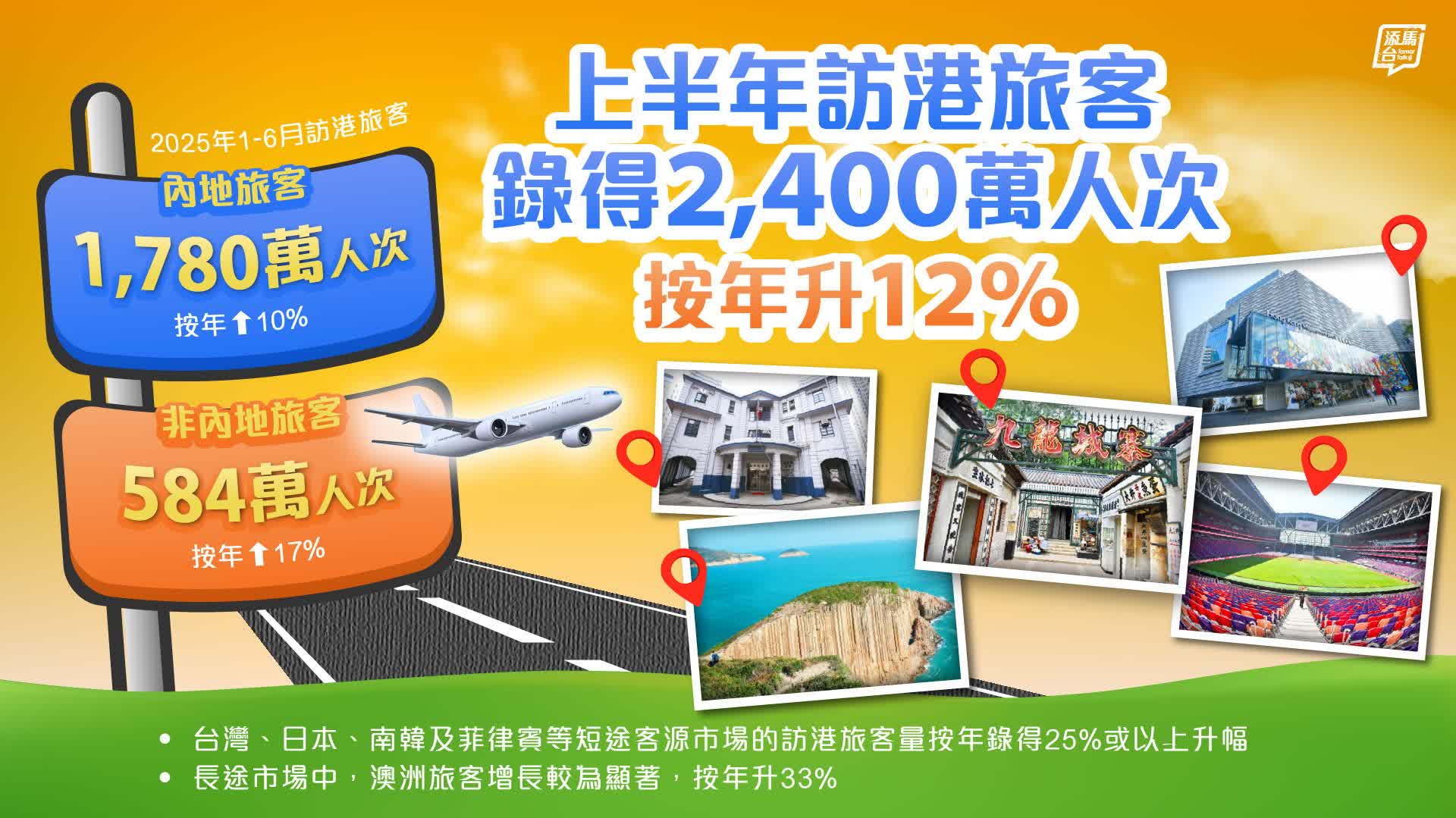 根據香港旅遊發展局最新公布的數字,6 月訪港旅客數字為348 萬人次,按年上升11%。至於今年上半年(1 至6 月),訪港旅客量穩步增長,共錄得約2,400 萬訪港旅客人次,按年增加12%。看圖了解更多。