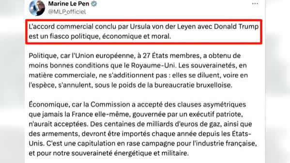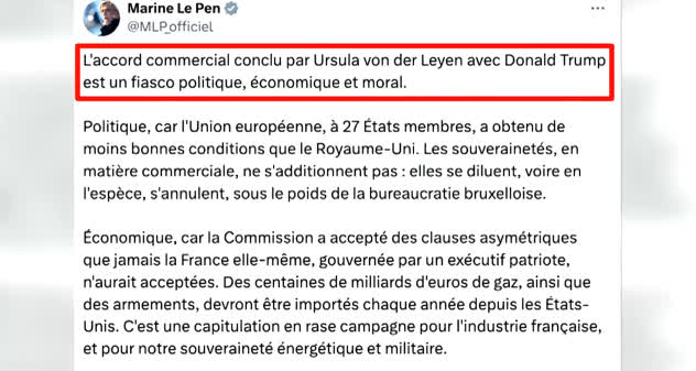 據央視新聞報道,法國極右翼領導人勒龐27日在社交媒體上稱,美歐達成的新貿易協議是歐盟在政治、經濟和士氣上的多重慘敗。她指出,歐盟與美國是在條件不平等的情況下達成的協議,這份貿易協議對法國工業、能源和軍事領域而言堪比「投降」。