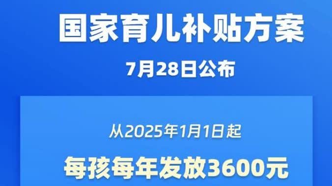 據新華社報道,7月28日,國家育兒補貼制度實施方案公布,從2025年1月1日起,無論一孩、二孩、三孩,每年均可領取3600元補貼,直至年滿3周歲。
