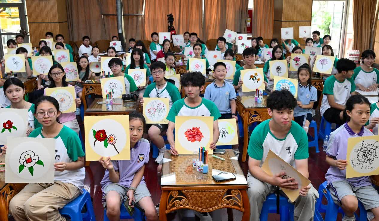 山茶園中,渝澳青少年執彩鉛凝神描繪重慶市花山茶。600餘品種、萬株茶花在南山植物園蓬勃生長,其奔放艷麗恰如重慶人熱情勇敢的品格,成為兩地青少年觀察自然的窗口。