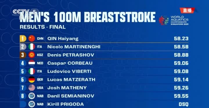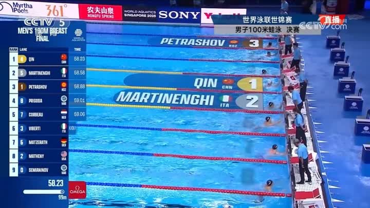大公文匯全媒體報道,2025新加坡泳聯世錦賽,男子100米蛙泳決賽,中國選手覃海洋出戰。