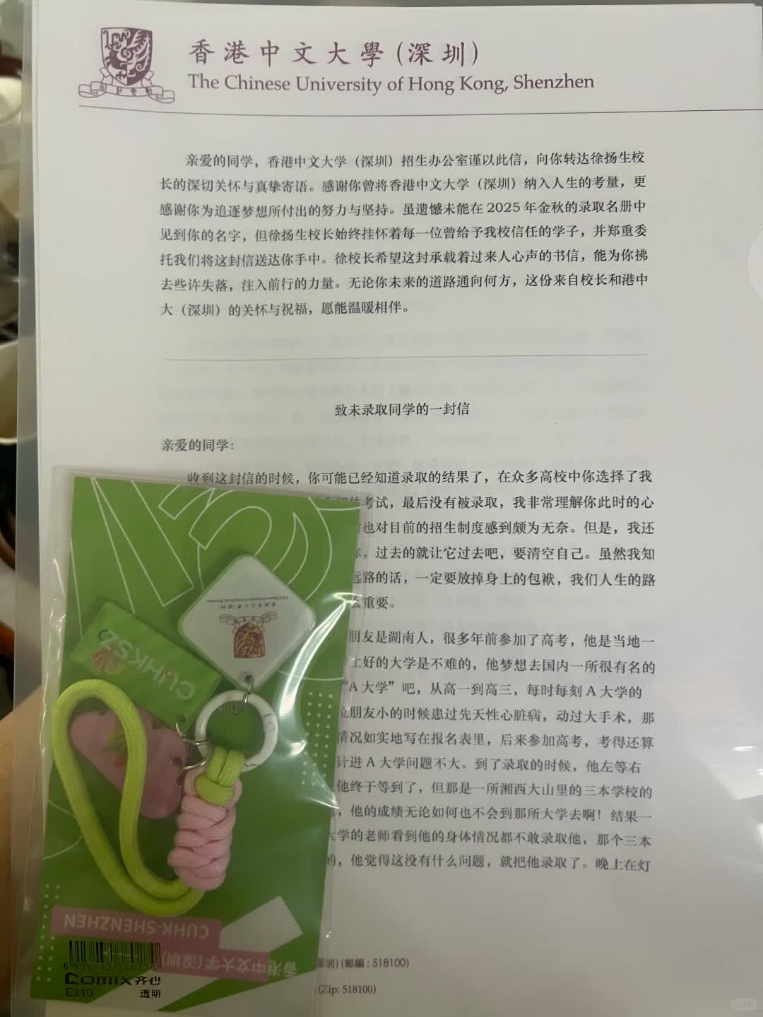 大公文匯網綜合報道,近日,香港中文大學(深圳)郵寄「未錄取通知書」一事登上熱搜,引發網友熱議。多名網友在社交平台上曬出了該校郵寄的「未錄取通知書」,信封內不僅有校長徐揚生署名的一封信,還附有一個印着該校logo的小禮物。