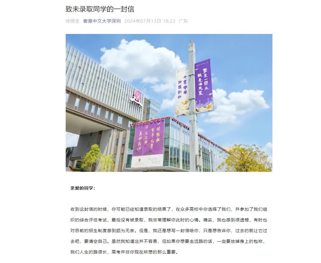 此前,「香港中文大學深圳」公眾號也推送了這封「致未錄取同學的一封信」。信中提到,「收到這封信的時候,你可能已經知道錄取的結果了,在眾多高校中你選擇了我們,並參加了我們組織的綜合評估考試,最後沒有被錄取,我非常理解你此時的心情。確實,我也感到很遺憾,有時也對目前的招生制度感到頗為無奈。但是,我還是想寫一封信給你,只是想告訴你,過去的就讓它過去吧,要清空自己。」