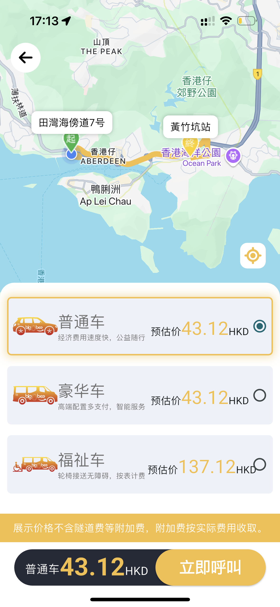 記者首先使用大黃蜂愛心車隊的專屬APP「BigBee」進行即時叫車,相比其他三家,該平台不可預約用車的時間。該應用程式畫面比較簡潔,確定了起點、終點後可以選擇車型,並看到預估價格,確認呼叫並不需要提前支付車費,但要注意的是平台標註有「展示價格不含隧道費等附加費,附加費按實際費用收取」的提示。