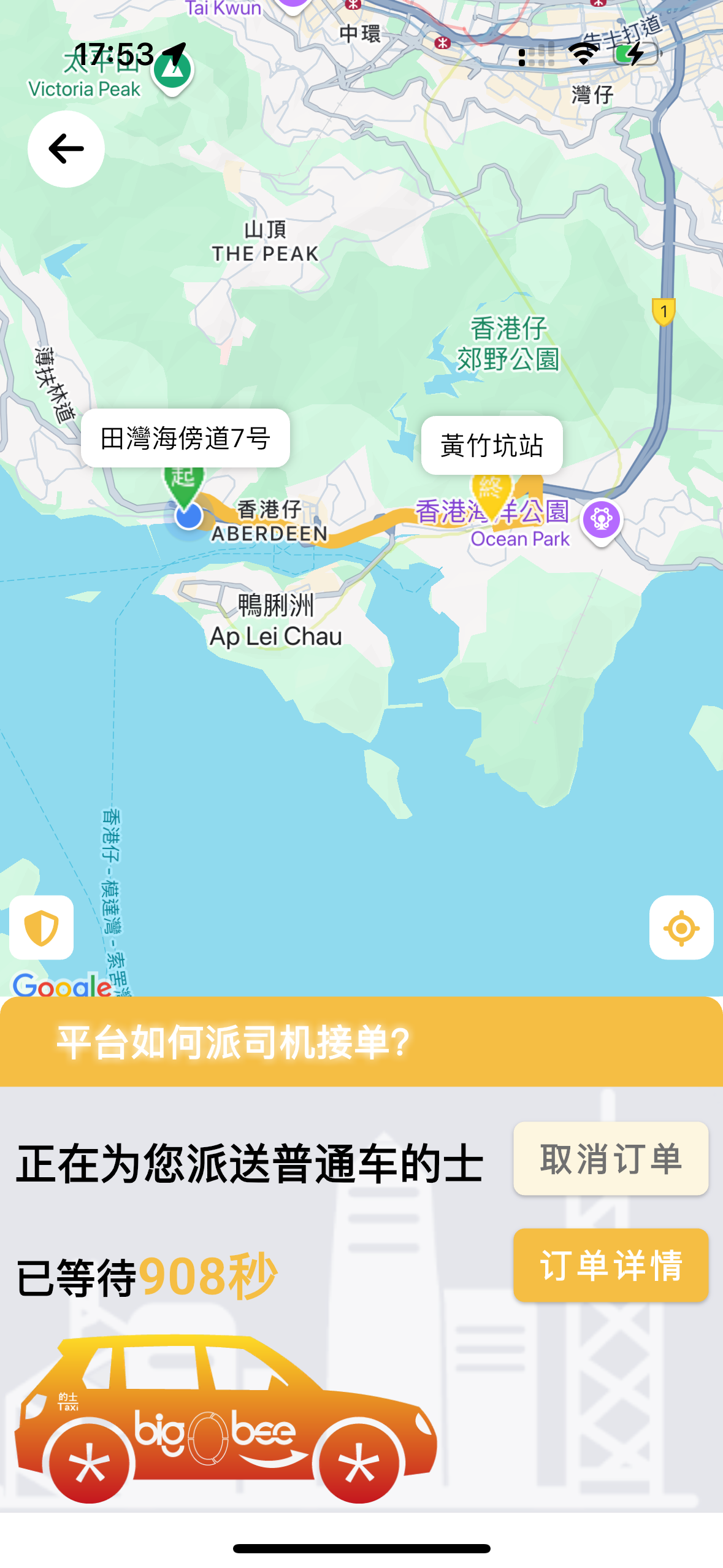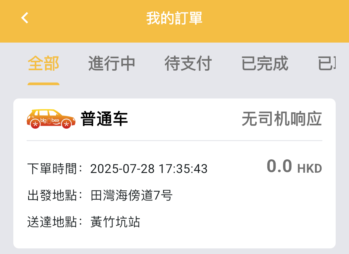 記者於傍晚17時嘗試呼叫,等待超過10分鐘後仍無司機接單,且無法查看附近具體的士情況,點擊取消訂單則顯示「無司機響應」。據了解,該車隊現時有208架的士投入使用,還有84輛的士會在運輸署批出牌照後開始服務,目標未來車隊會有一千輛的士。
