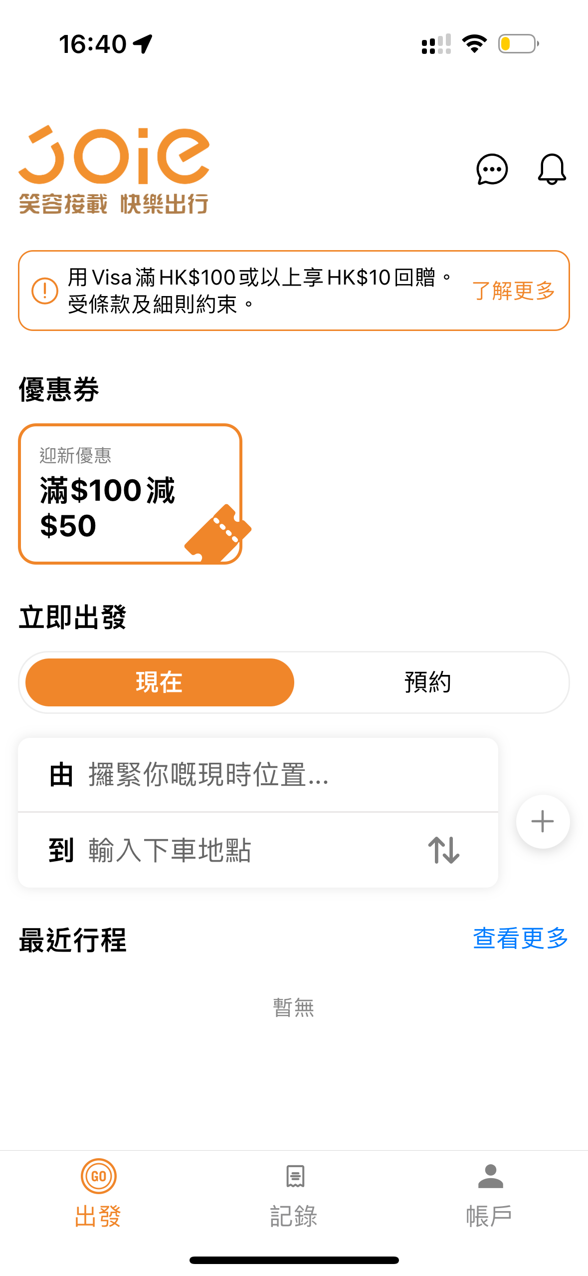 隨後記者嘗試樂行車隊的APP「JOIE樂行」,該的士平台早前於3月底開始試行。打開應用程式可以見到,平台向用戶派發滿100減50元的乘車優惠券,有效期為一個月。
