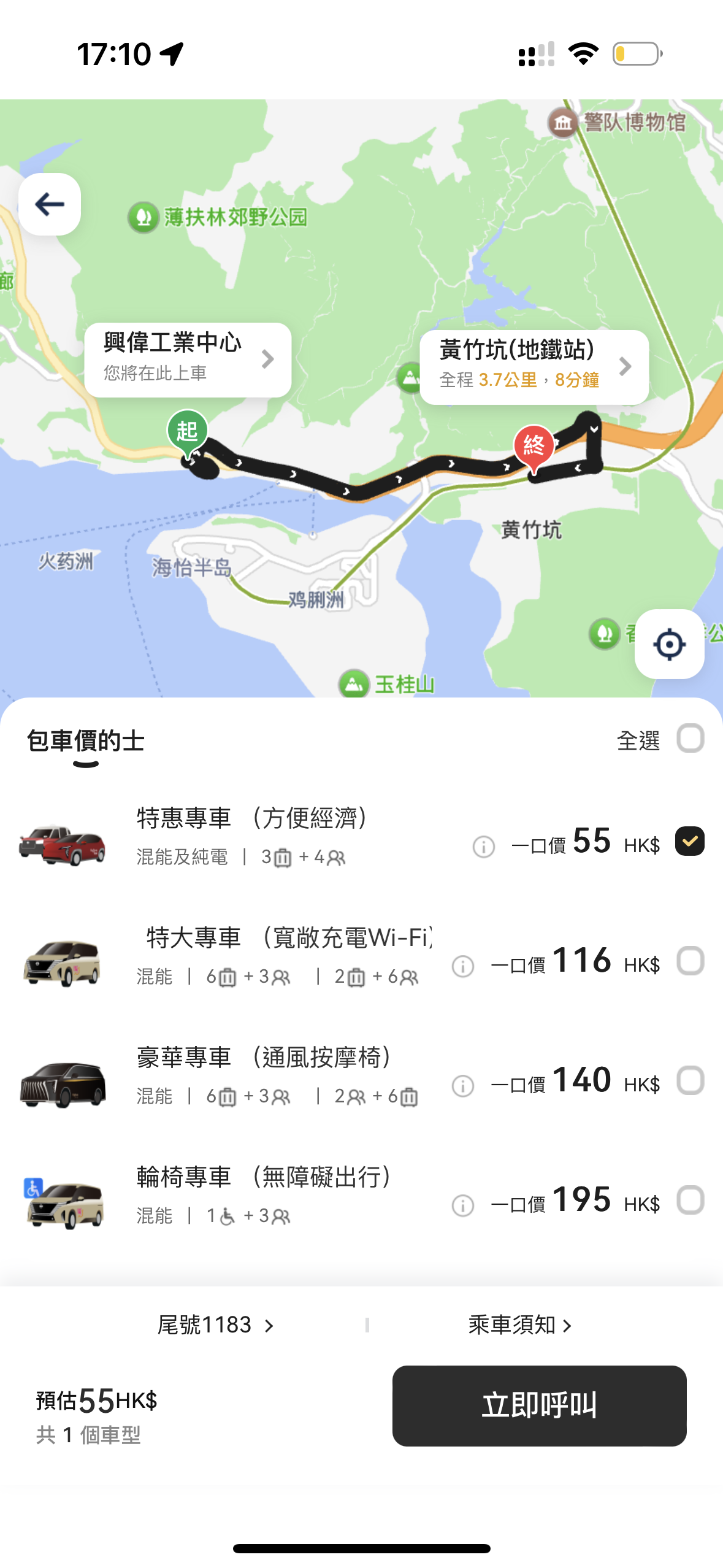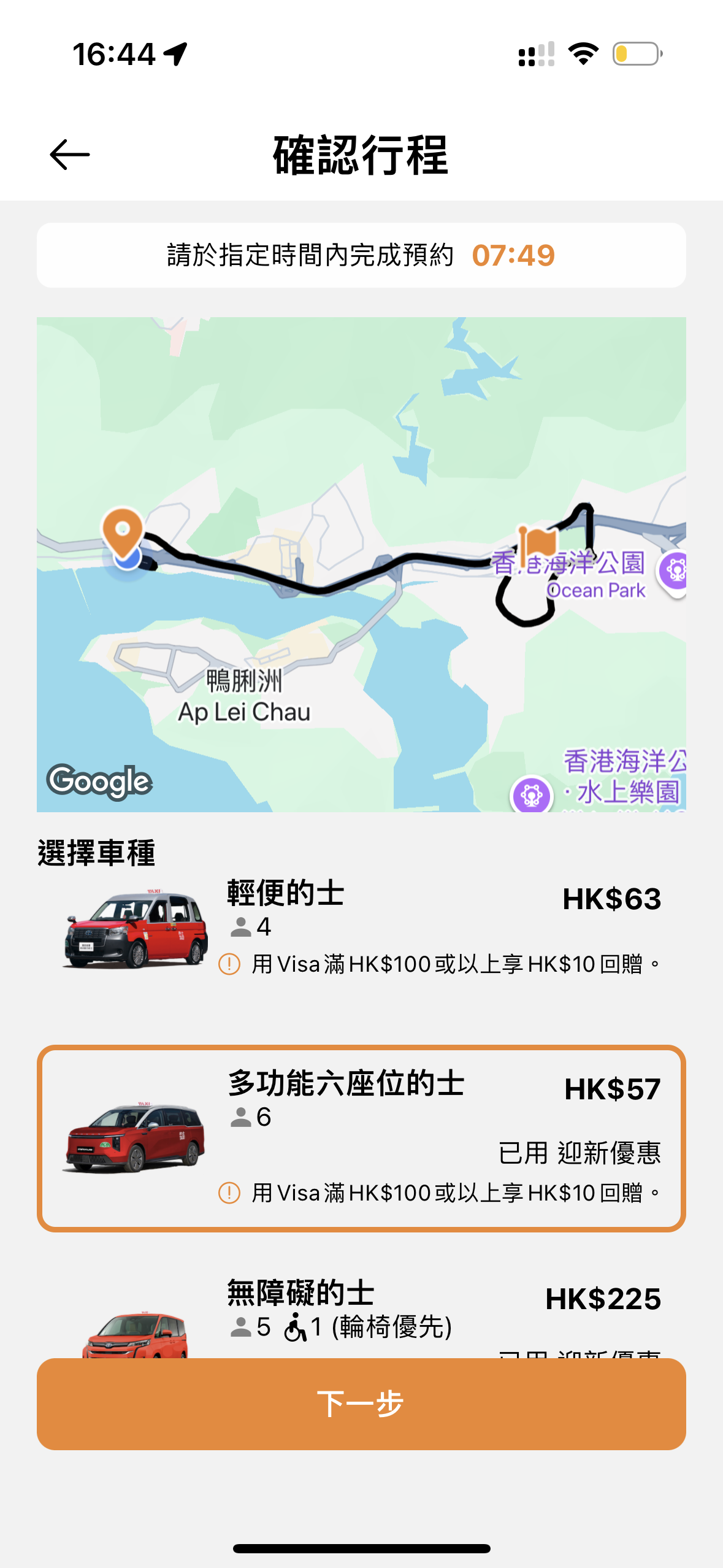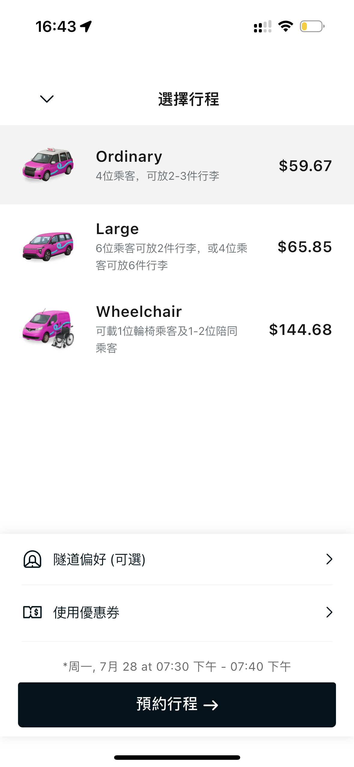 乘客在確定起點、終點和預約時間後,就可以選擇車型,包括輕便的士、多功能六座的士、無障礙的士。選擇後需要先繳付車費,有多種線上支付方式可供選擇,隨後等待系統配對司機,若配對成功,乘客將會獲得配對碼用以乘車;而若5分鐘內未配對,表示該時段已滿,系統自動取消訂單並於7個工作天內退款。