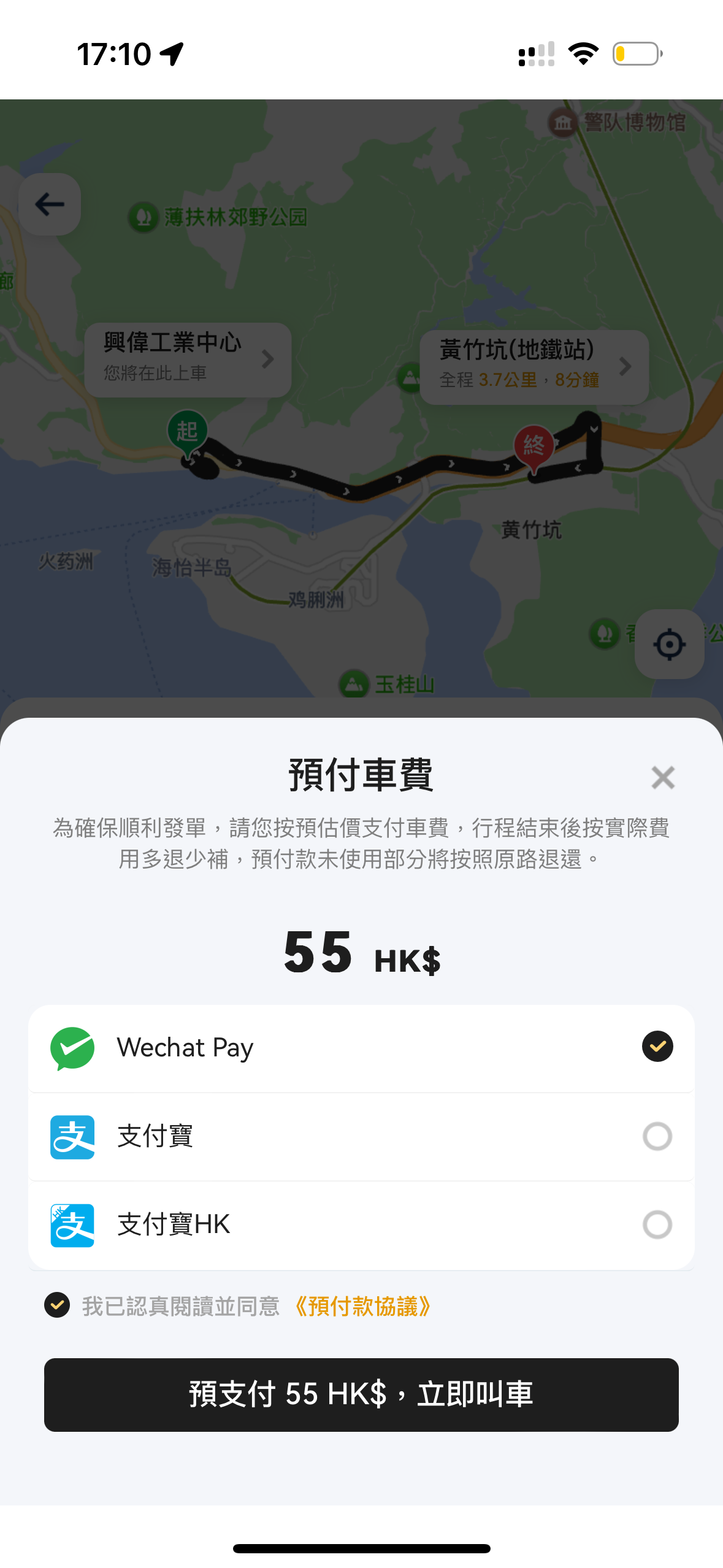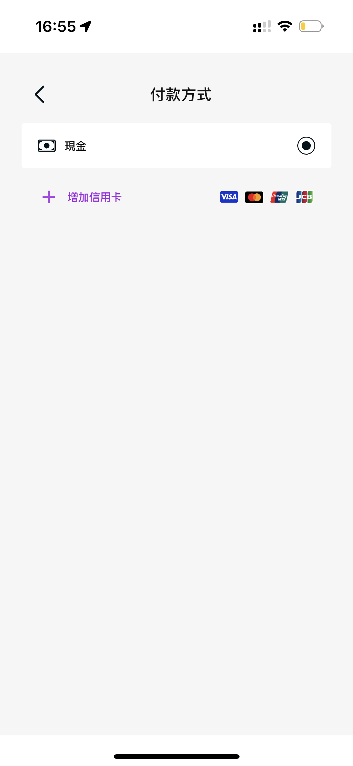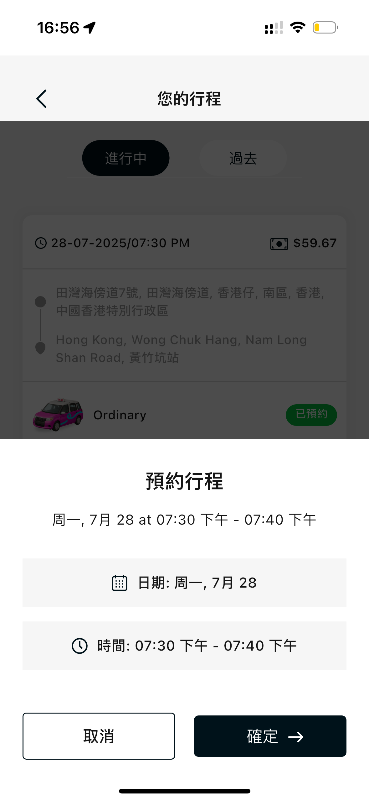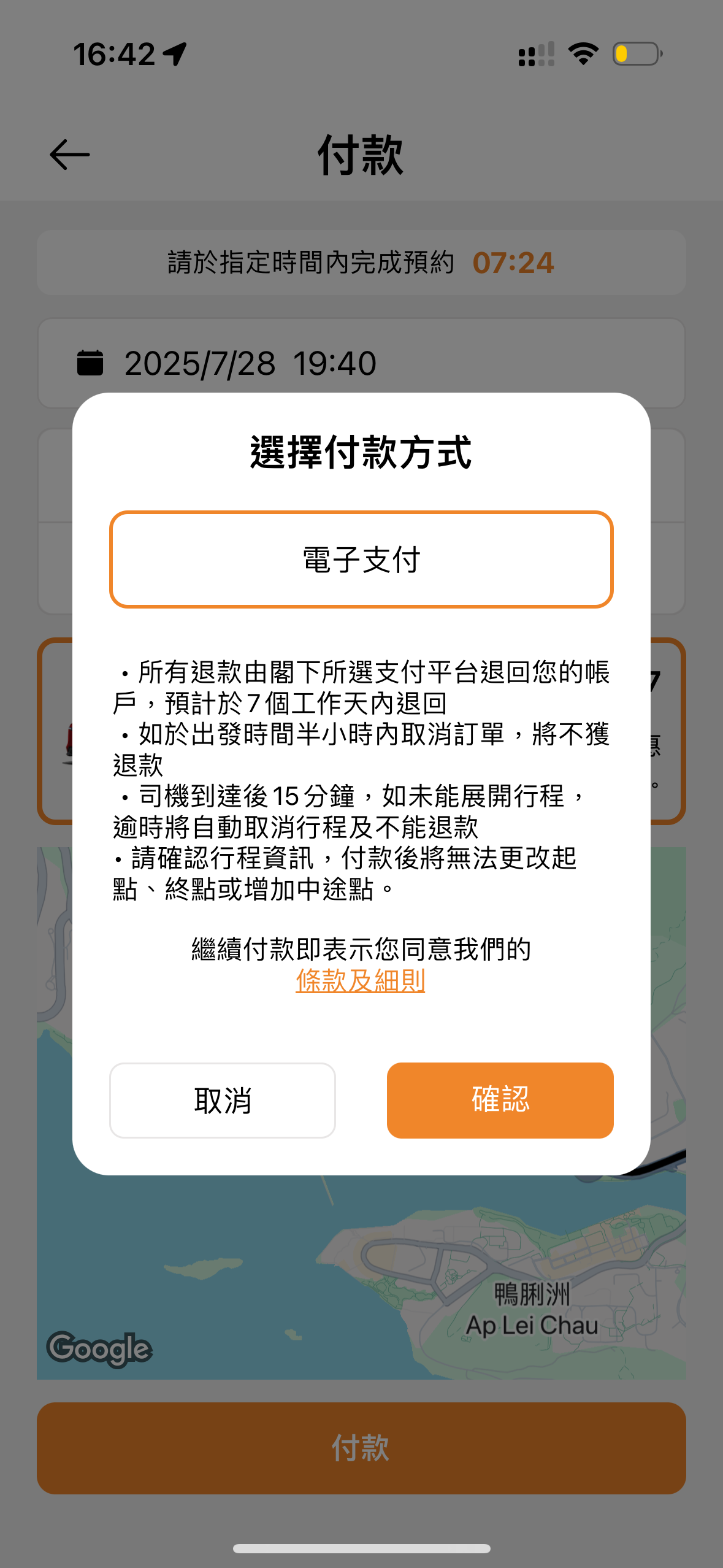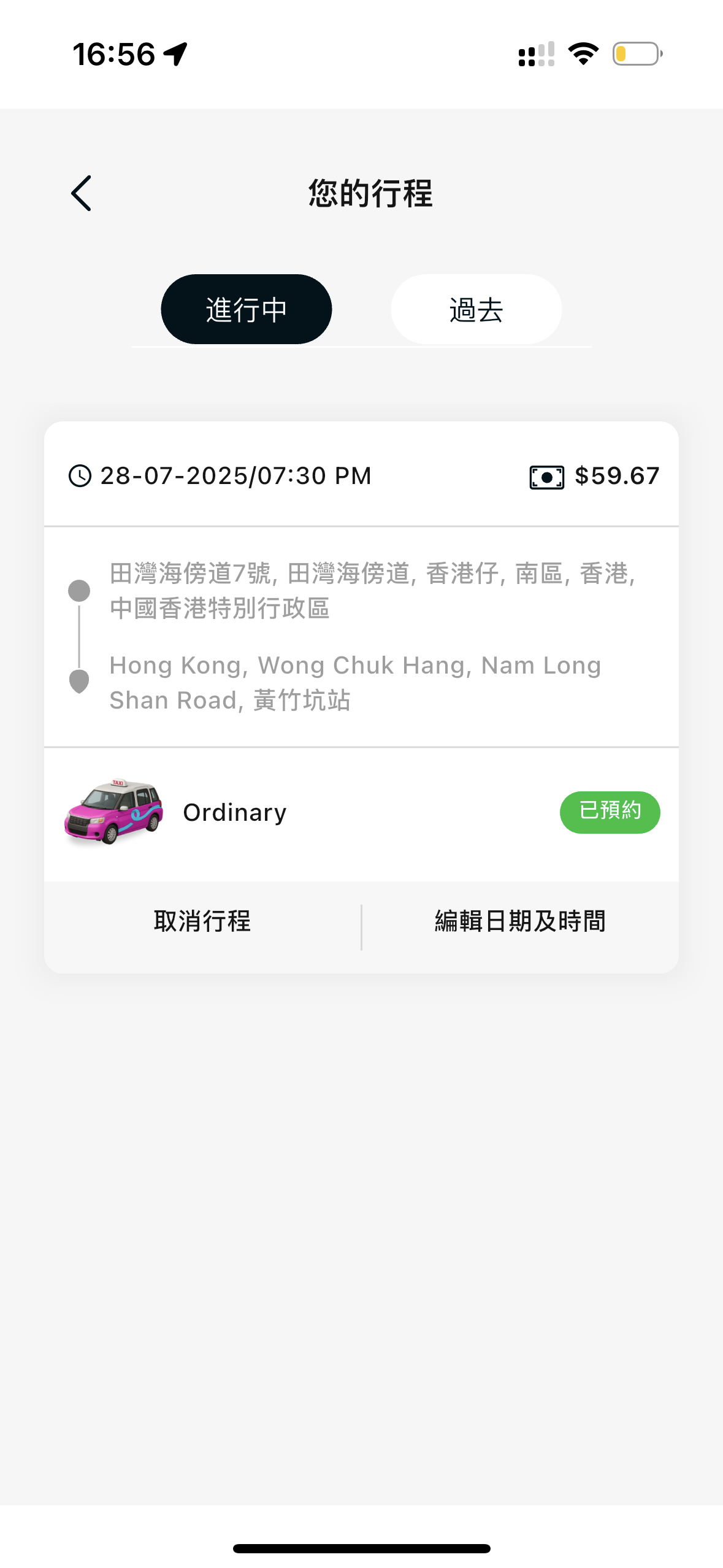 確認行程後,乘客需要選擇支付方式,目前僅有現金和信用卡兩種。完成預約後,系統會匹配司機,在未接單的情況下,乘客可以修改行程的日期及時間。