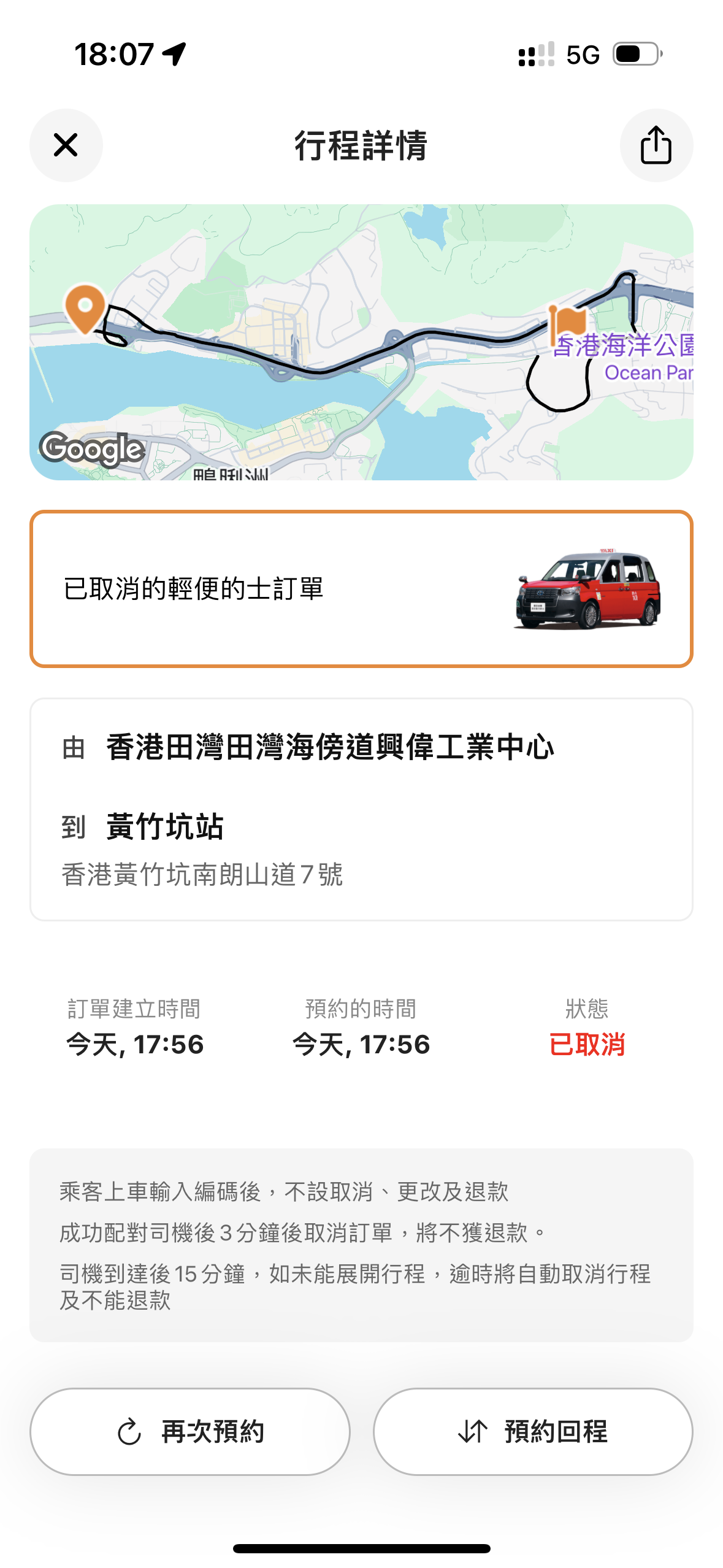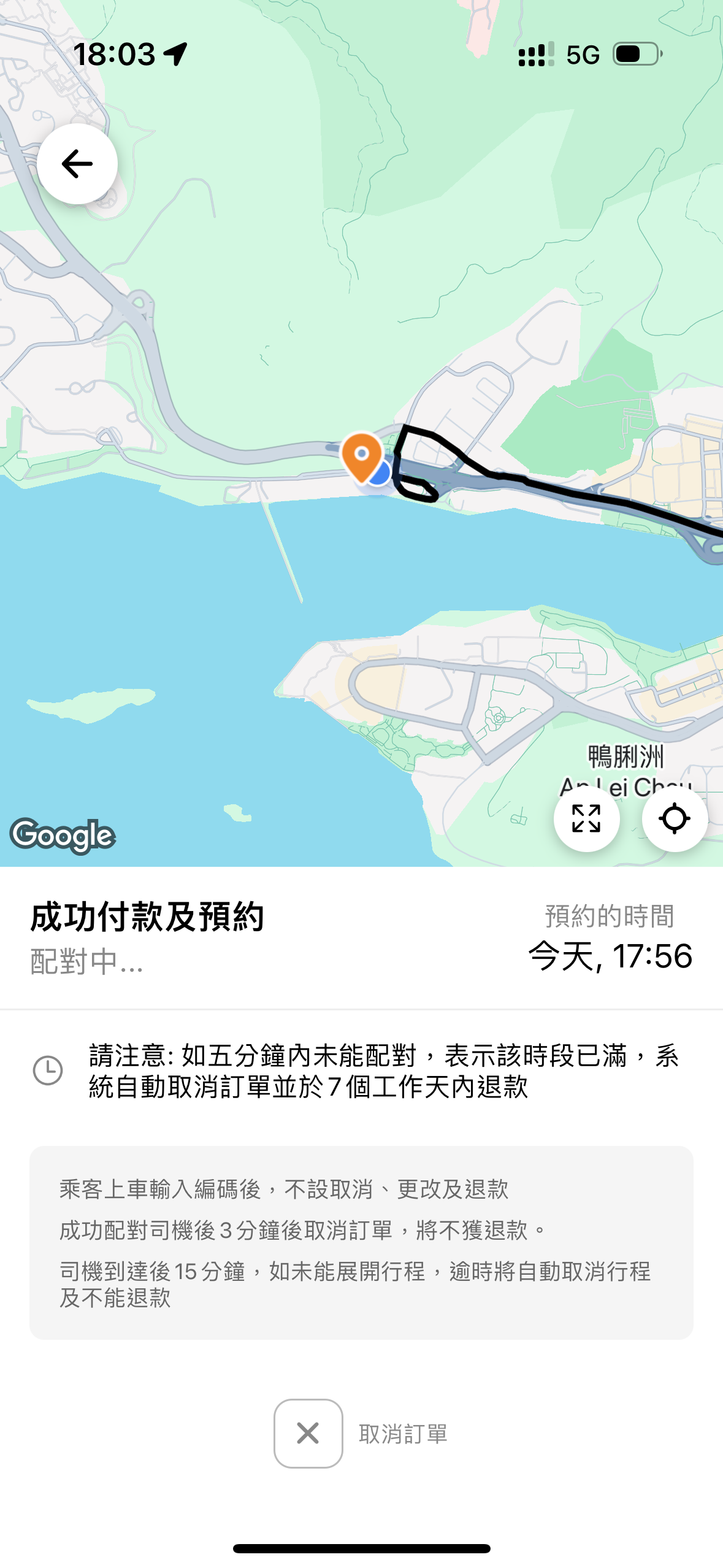 記者完成支付並等待超過5分鐘後,系統仍顯示訂單正在配對中且未自動取消,隨後記者撥打支援熱線詢問,客服表示正常情況下系統會自動取消,平台不清楚為何該訂單仍在配對中,「遇到該情況乘客自行取消就行,不會對賬號產生影響,退款也會自動返回的。」