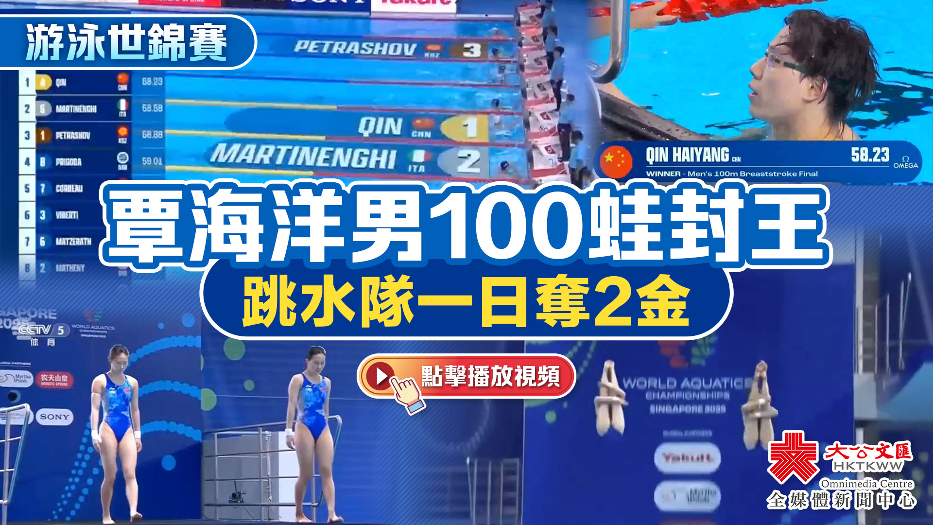 大公文匯全媒體報道,2025年世界游泳錦標賽,於7月11日至8月3日在新加坡舉行。今日(28日)中國隊捷報頻頻,中國跳水夢之隊繼續壟斷金牌,在女子雙人10米台及男子雙人3米板奪金,覃海洋男子100米蛙泳奪游泳隊首金,女子100米蝶泳決賽張雨霏56秒47獲得第四。