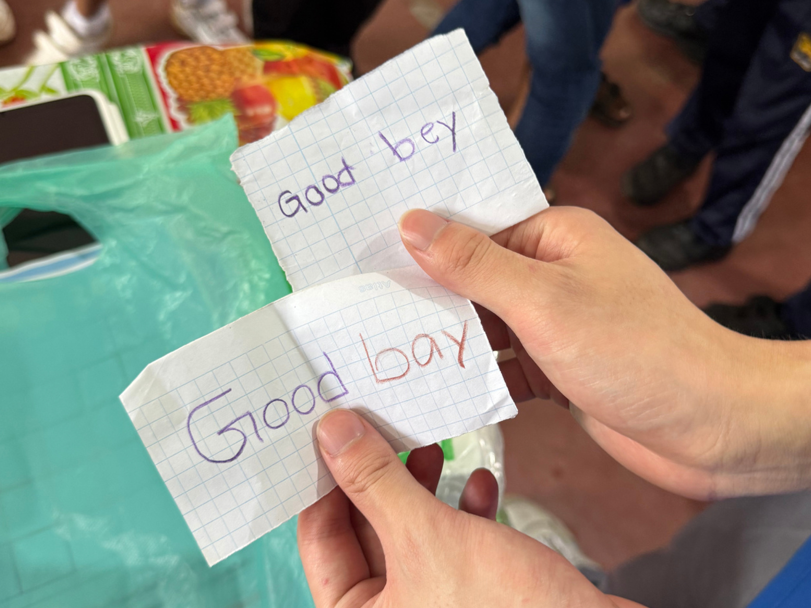 在整個實踐過程中,何莉筠認為遇到的最大困難是語言障礙。因為該地區主要使用當地方言,英語水平不足以進行順暢的日常交流,而玩遊戲過程中特別需要溝通和言語交流,因此言語對整個項目實踐產生了顯著影響。不過,所幸有當地的醫科學生全程參與翻譯和教學,幫助他們克服語言障礙。活動結束後,小朋友還通過寫紙條向團隊成員「說再見」。