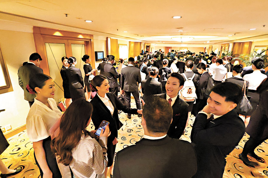 香港文匯報記者昨日在現場所見,逾百名精心裝扮的應徵者提早到場,他們都身穿筆挺的職業套裝、手拿履歷,大廳內瀰漫着既緊張又期待的氛圍。有人低聲練習自我介紹,有人翻閱面試攻略作最後準備,還有人互相交流應徵心得,希望能增加成功機會。
