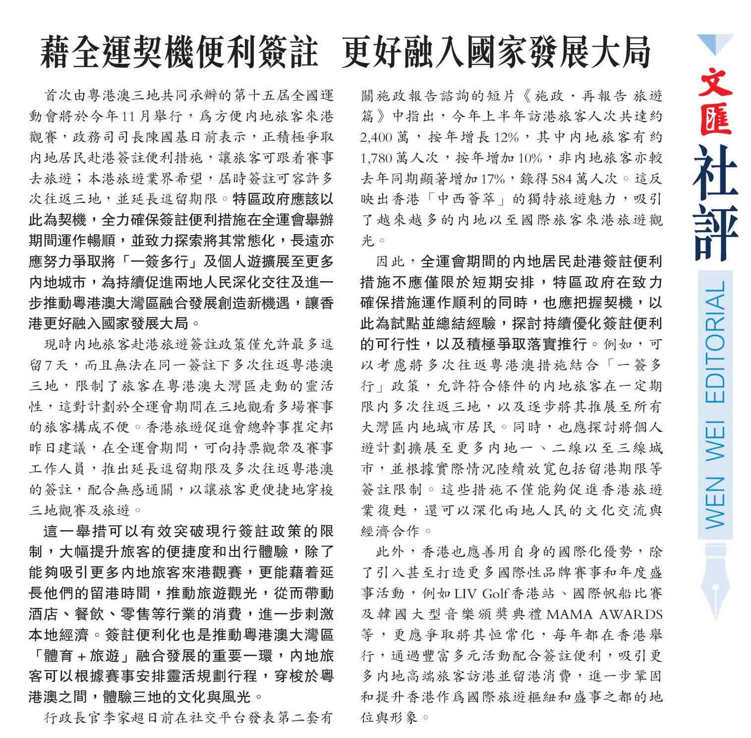 首次由粵港澳三地共同承辦的第十五屆全國運動會將於今年11月舉行,為方便內地旅客來港觀賽,政務司司長陳國基日前表示,正積極爭取內地居民赴港簽註便利措施,讓旅客可跟着賽事去旅遊;本港旅遊業界希望,屆時簽註可容許多次往返三地,並延長逗留期限。特區政府應該以此為契機,全力確保簽註便利措施在全運會舉辦期間運作暢順,並致力探索將其常態化,長遠亦應努力爭取將「一簽多行」及個人遊擴展至更多內地城市,為持續促進兩地人民深化交往及進一步推動粵港澳大灣區融合發展創造新機遇,讓香港更好融入國家發展大局。
