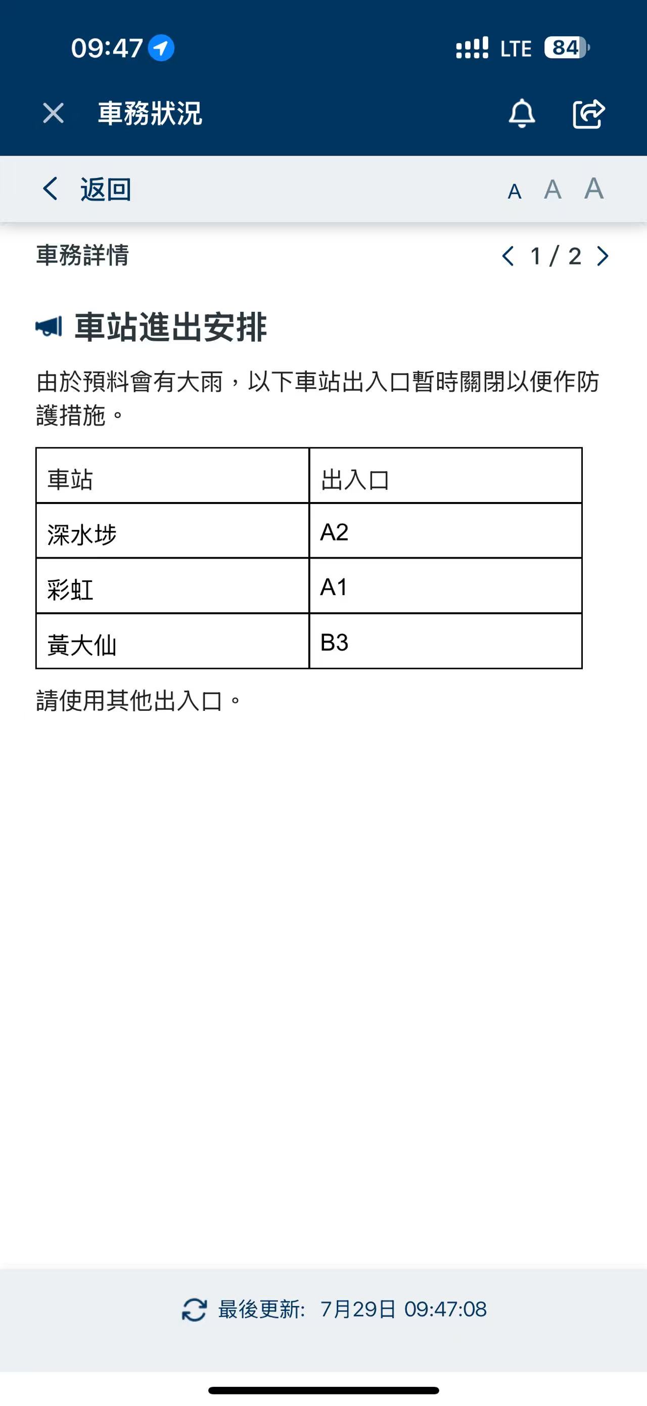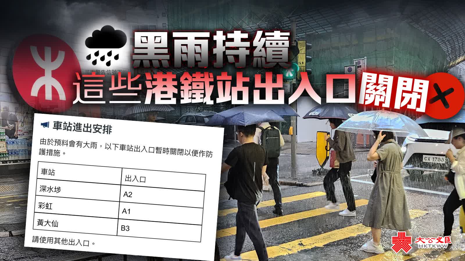大公文匯全媒體報道,黑色暴雨警告信號現正生效。本港多地普降暴雨,並有水浸發生。港鐵表示,由於預料會有大雨,深水埗站A2口、彩虹站A1口及黃大仙站B3口暫時關閉,以便作防護措施。