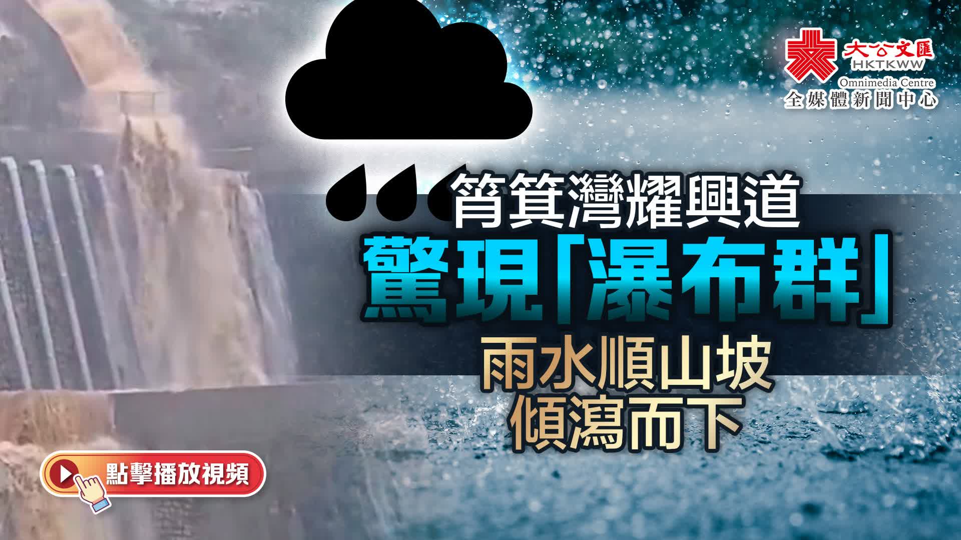 有網友於社交平台發布視頻,筲箕灣耀興道山坡驚現「瀑布群」,大量雨水順着山坡渠道傾瀉而下,形成多幅「瀑布」,場面相當壯觀。