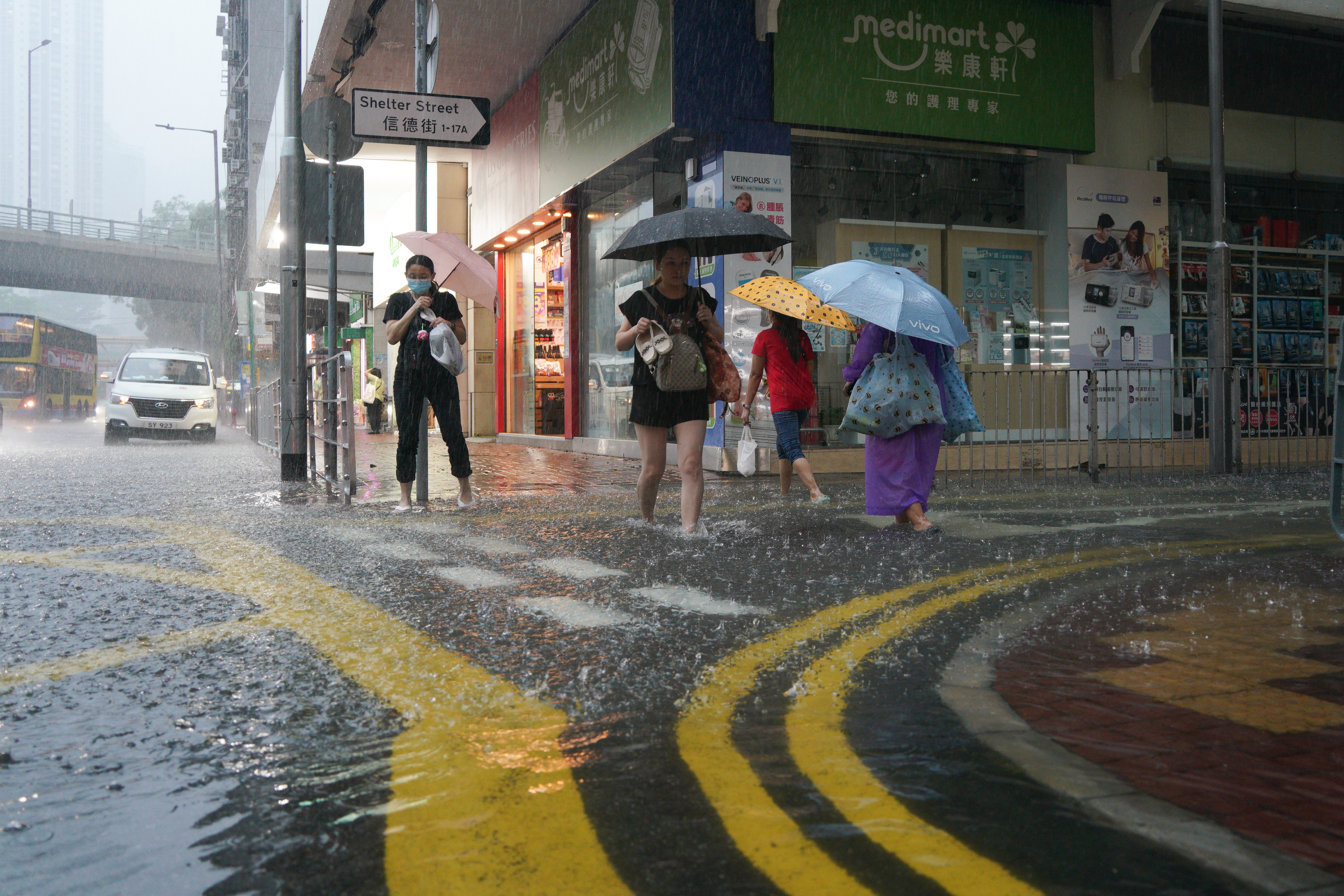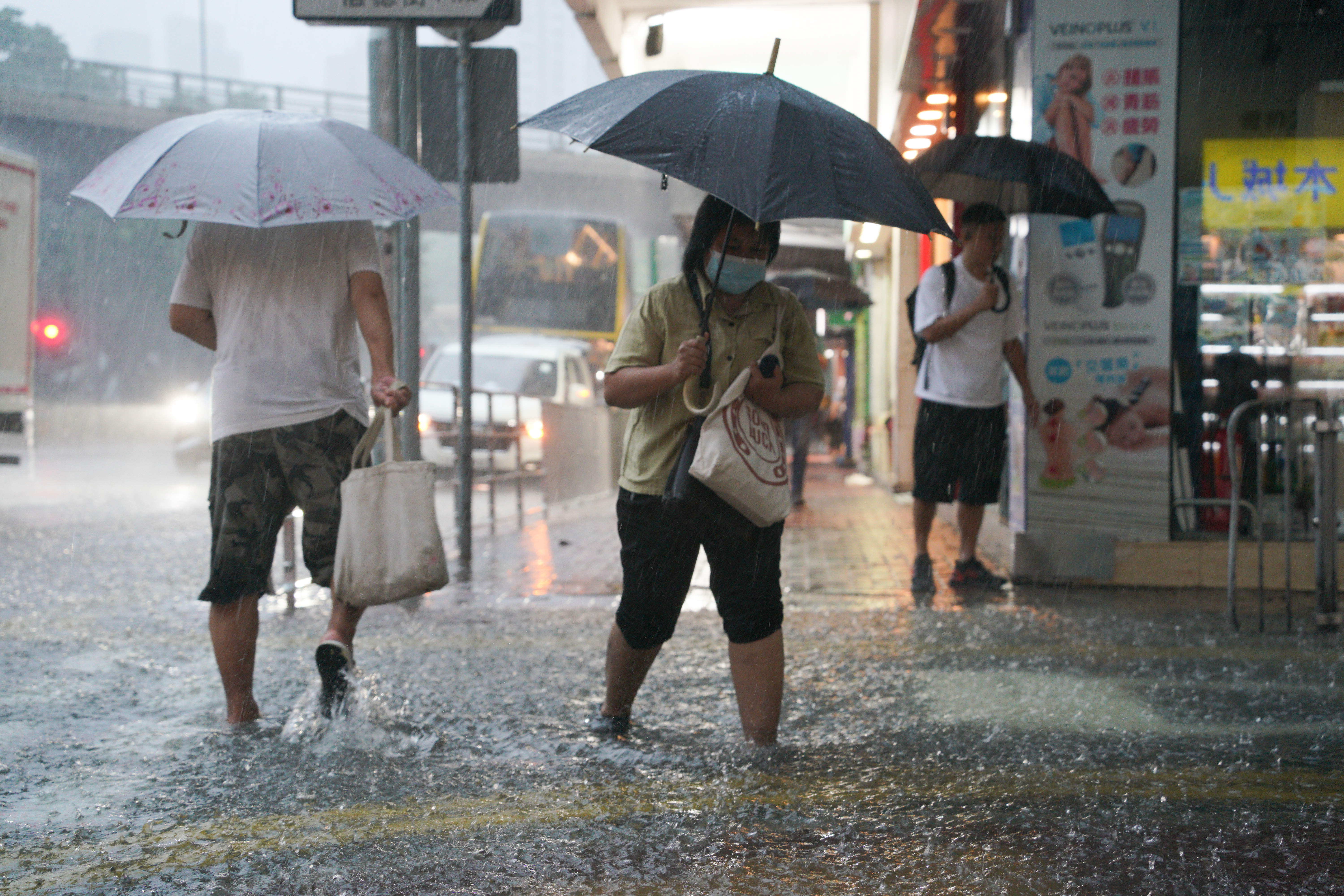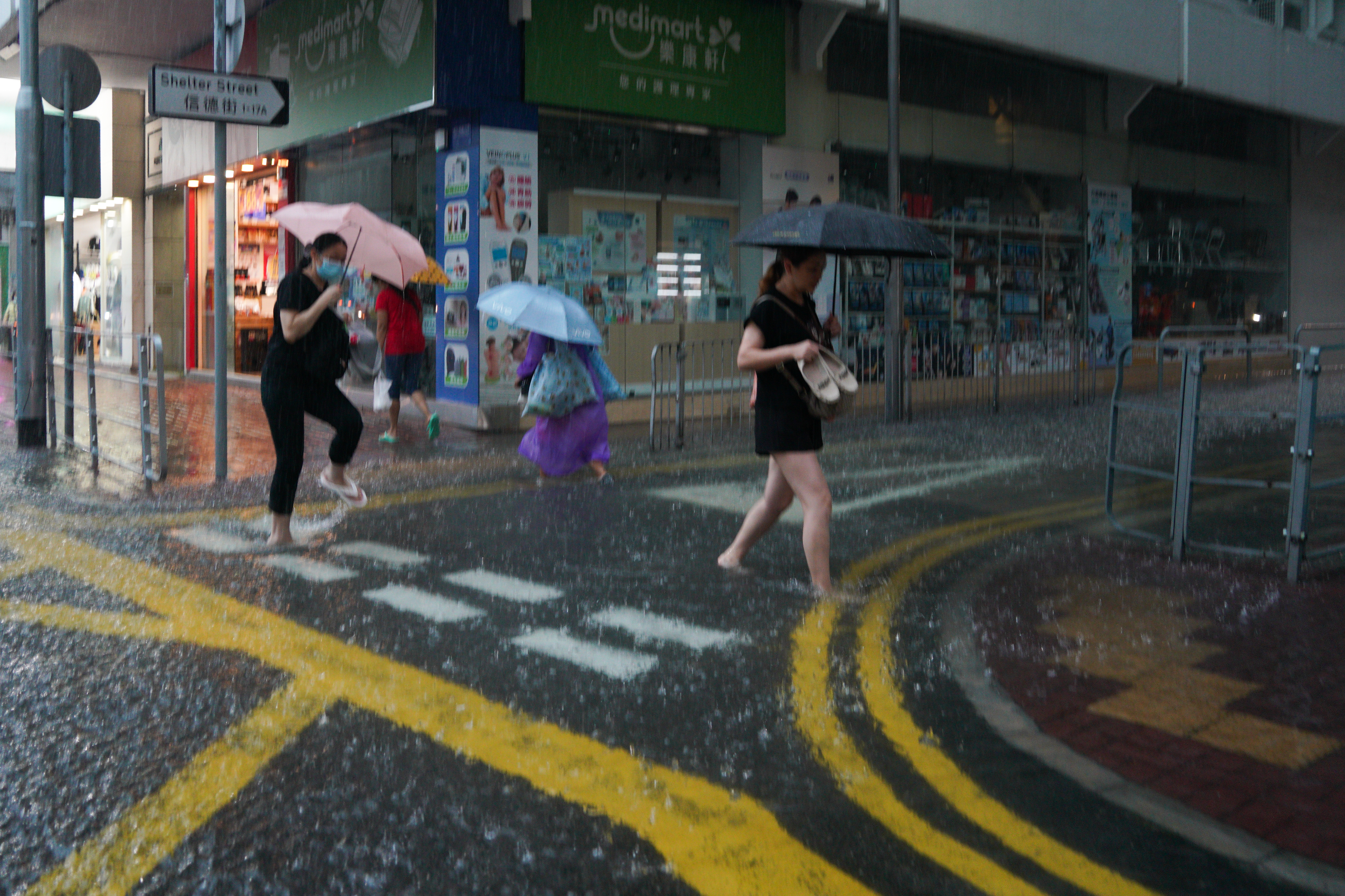 大公文匯全媒體報道,天文台在今日(29日)上午9時10分發出今年首個黑色暴雨警告信號,其中港島多地雨勢特別大。在銅鑼灣的街道上,行人路及行車路均被淹浸,現場可見雨水已經深至市民腳踝,不少居民只能涉水而行。