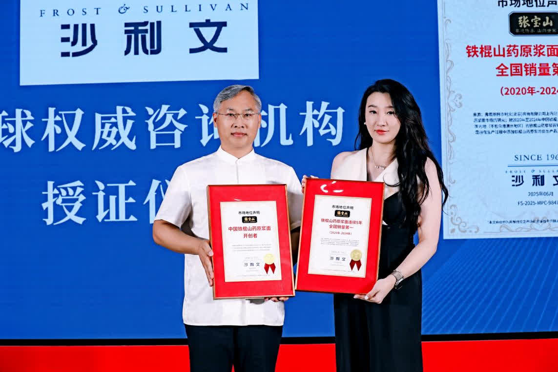 7月28日,「張寶山·鐵棍山藥原漿面開創者暨連續五年全國銷量第一」認證發布會在鄭州舉辦,國際權威機構沙利文(Frost & Sullivan)執行總監劉丹妮現場向張寶山品牌傳承人張小衛頒發證書,認證其為中國鐵棍山藥原漿面開創者身份,並以連續5年全國銷量第一的成績創下中國食養主食類產品新紀錄,成為行業唯一兼具「開創者」與「五年領跑者」雙重里程碑的品牌。