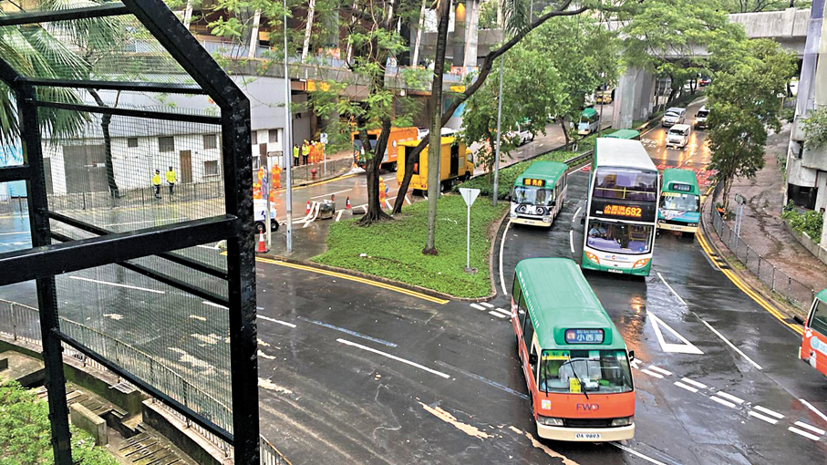 兩年前山洪肆虐的柴灣道迴旋處,昨日同樣出現類似當年洪流由連城道沖下的情況,但迴旋處水浸面積並不大,水深至小腿。其間,有渠務署人員到場清理,水浸情况迅速得到改善。渠務署表示,因應2023年9月發生的特大暴雨,渠務署已檢視柴灣道迴旋處一水浸個案成因,並完成多項小型工程,包括在翡翠道加建一條約300米長、1.65米直徑的新排水管道,並於翡翠道車路加建集水溝,以及於柴灣道迴旋處花園建造臨時地下雨水泵房及加建進水口,有效疏導並紓緩水浸情況。
