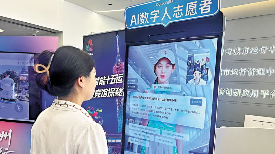 29日,在「全運廣州」小程序啟動儀式上,還正式推出即將運用於賽會服務的「AI數字人志願者」。香港文匯報記者在現場體驗發現,對於十五運會賽區的比賽、場館、交通等方面的信息,體驗者提出問題後能實現秒級回應。除了廣州賽區,香港、深圳等其他賽區的相關信息,亦一問便知。